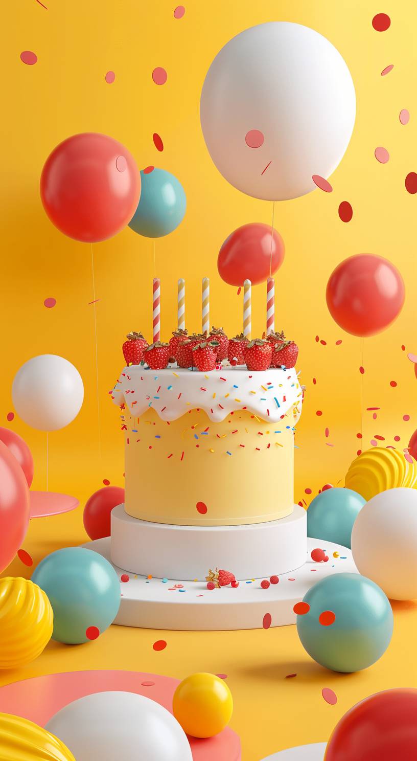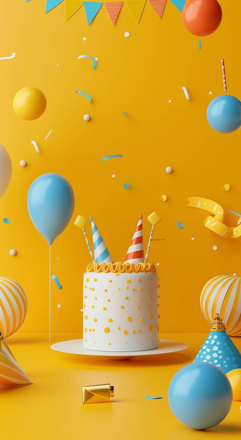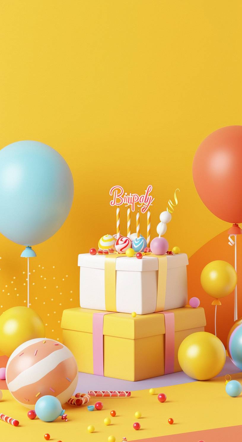3D 그래픽 디자인, 간단한 생일 요소, 다채로운 배경, 밝은 노란색.