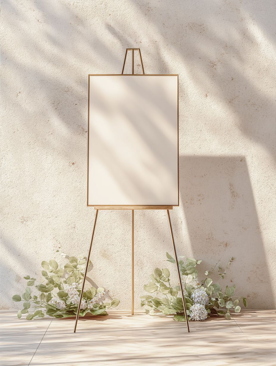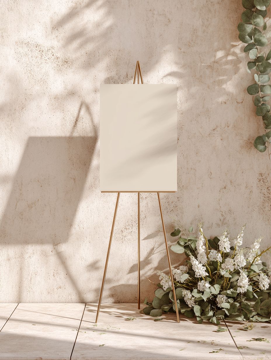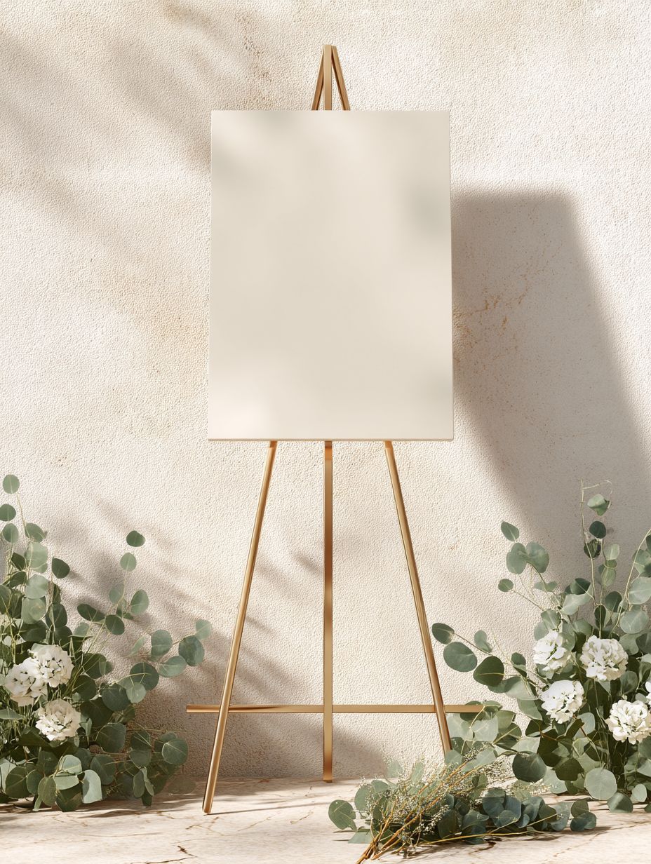 photo realistic scene of a vertical 18x24 inch wedding welcome sign mockup,placed on a minimalist thin metal gold easel stand against a textured pale stone wall. The sign is blank, with warm sunlight casting soft shadows. eucalyptus leaves and white delphiniums are arranged low at the base of the easel, editorial-style. Light, airy composition perfect for wedding brand previews or venue signage. Captured with Canon RF 85mm f/1.2L lens. --ar 3:4 --quality 2 --raw --stylize 50 --v 7.0