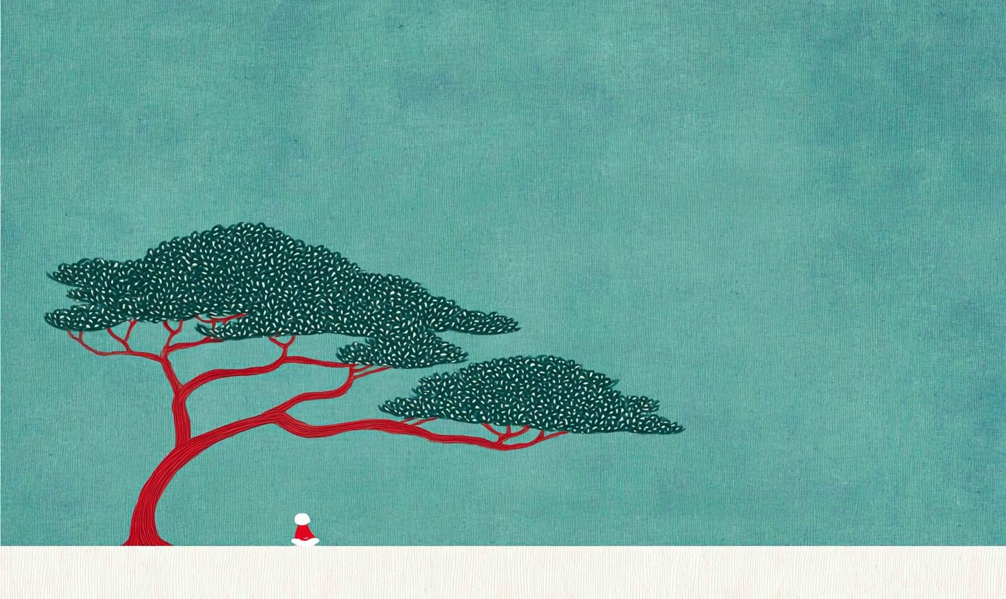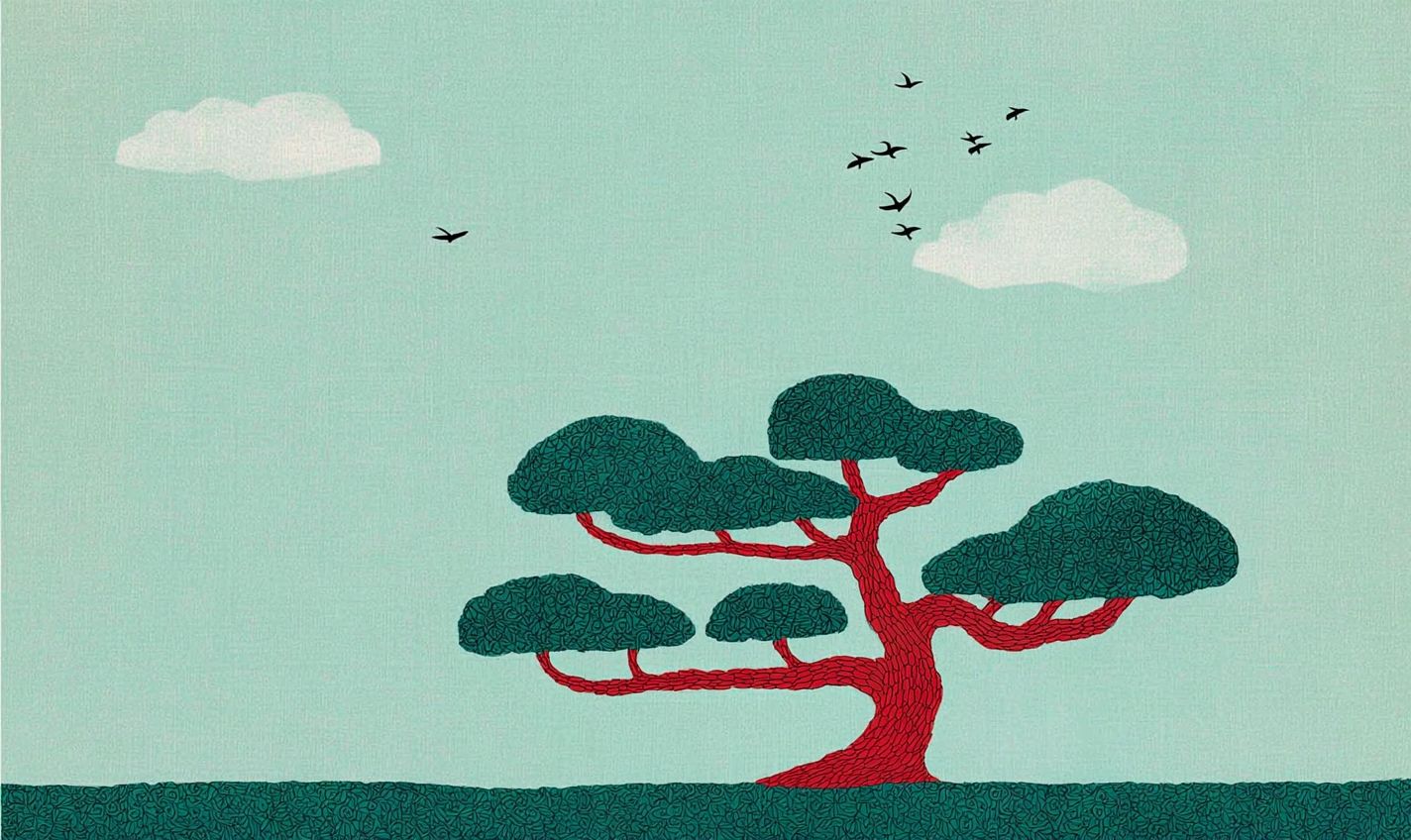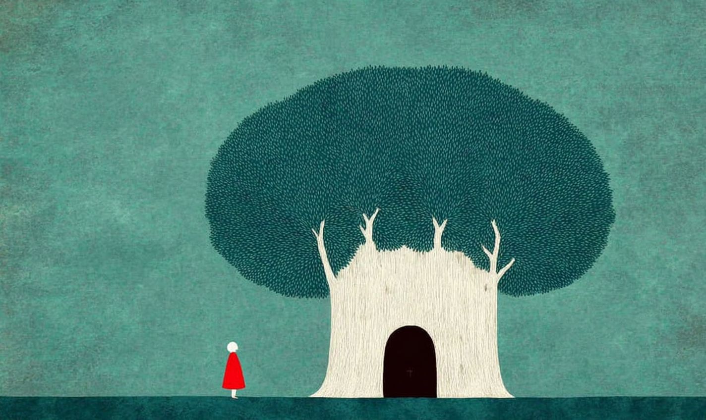나무 모양의 집, Goro Fujita와 Oliver Jeffers 스타일의 컨셉 아트, 간단한 배경, 안개 낀, 이상하고 차분한 분위기, 단순하다.
