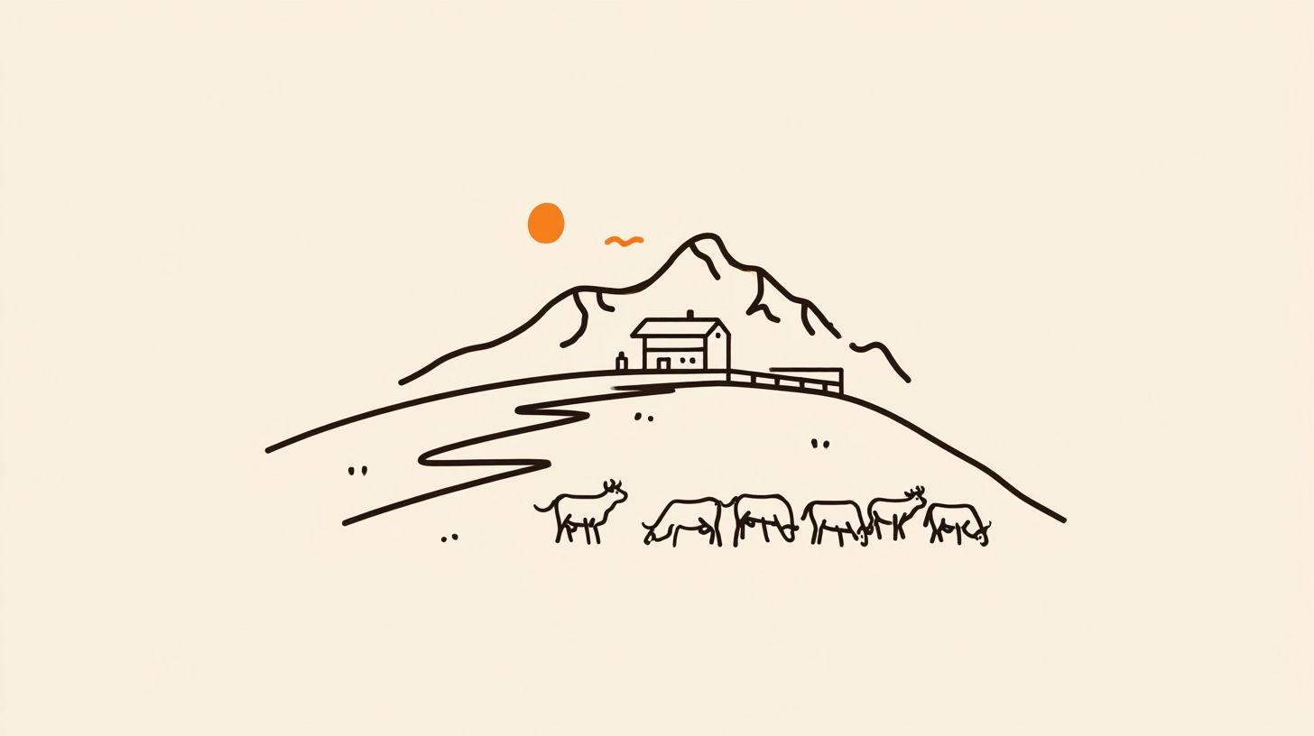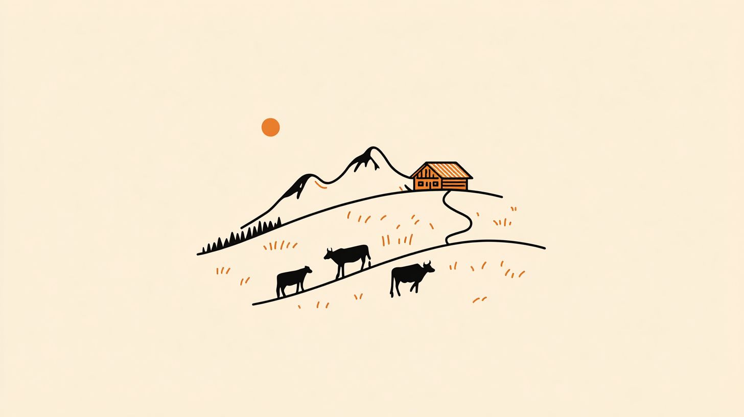 illustration of beautiful swiss alps with cows in the foreground, a walking path leading to a wooden house on top of the mountain, a green grassy field, a clear blue sky, golden hour lighting, snow-capped mountains in the background. --ar 16:9 --sref 4174831993 --s 50 --v 7.0