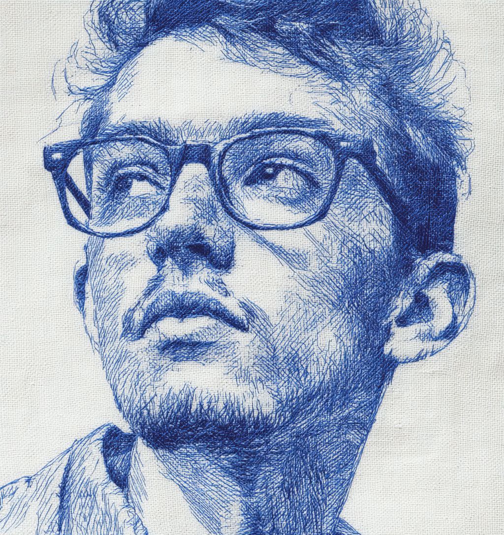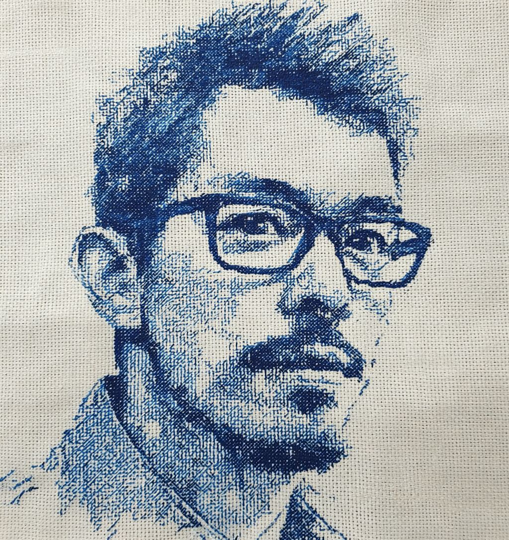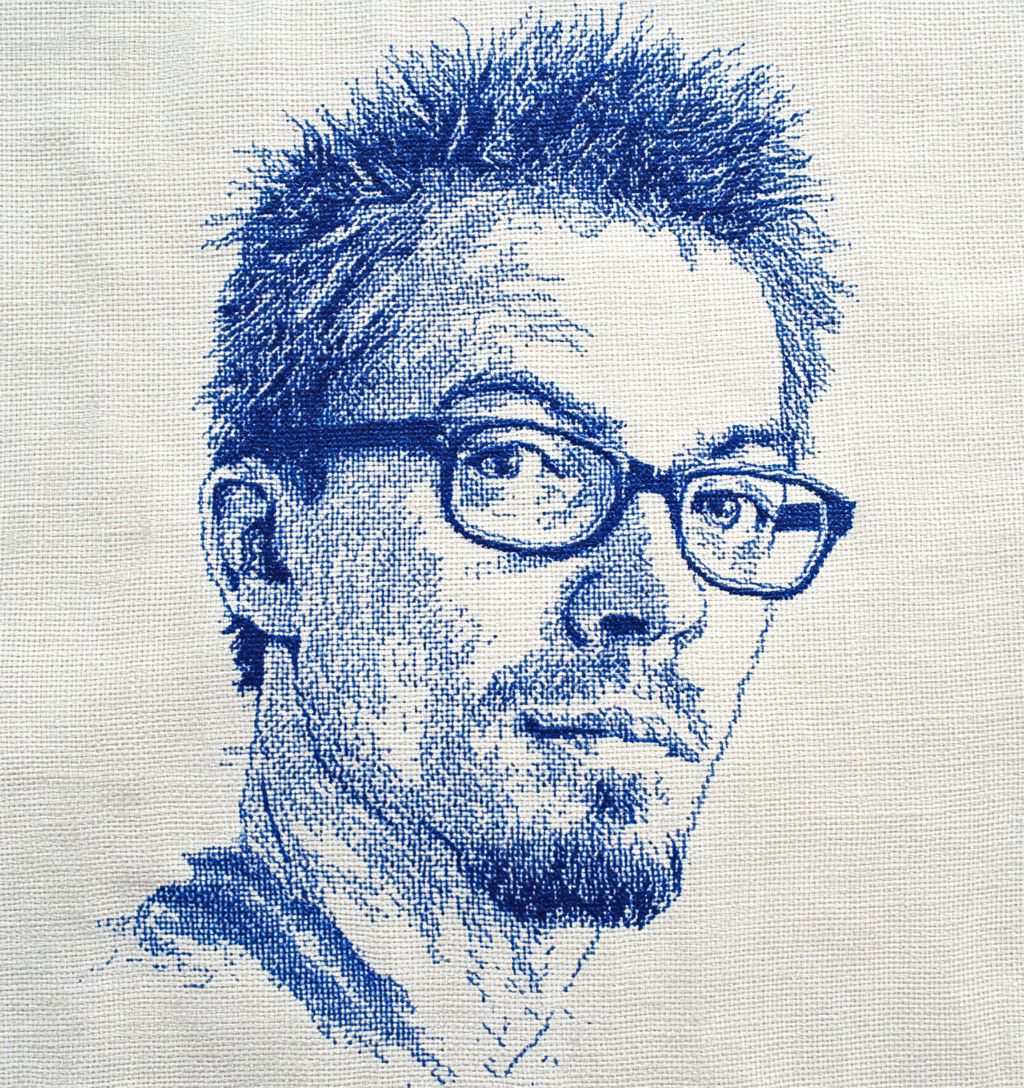간단한 크로스 스티치 초상화 패턴, 흰 천에 파란 잉크로 두꺼운 선, 안경을 쓴 짧은 머리와 턱수염을 가진 젊은 남성