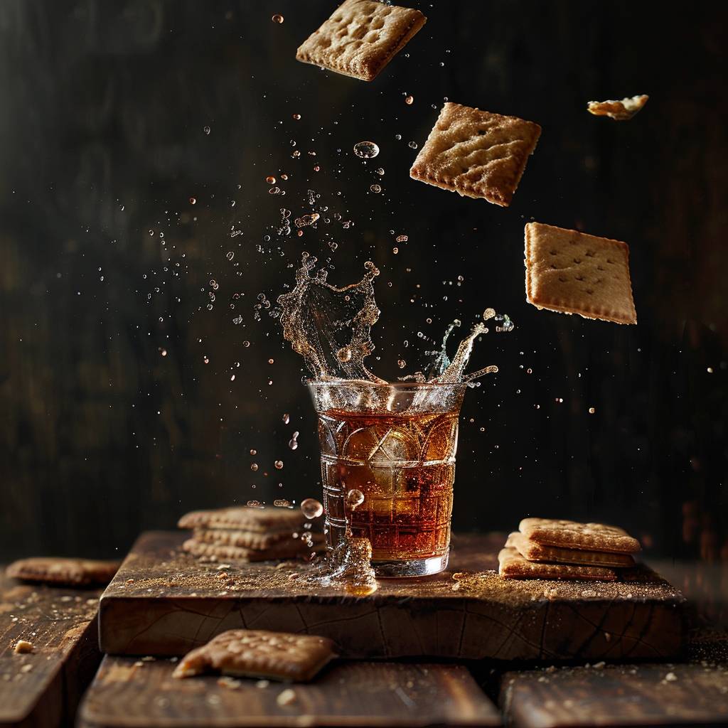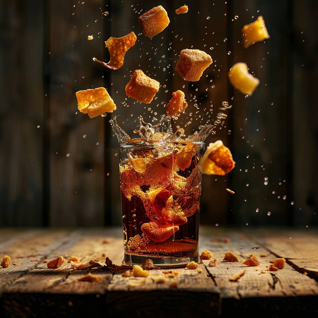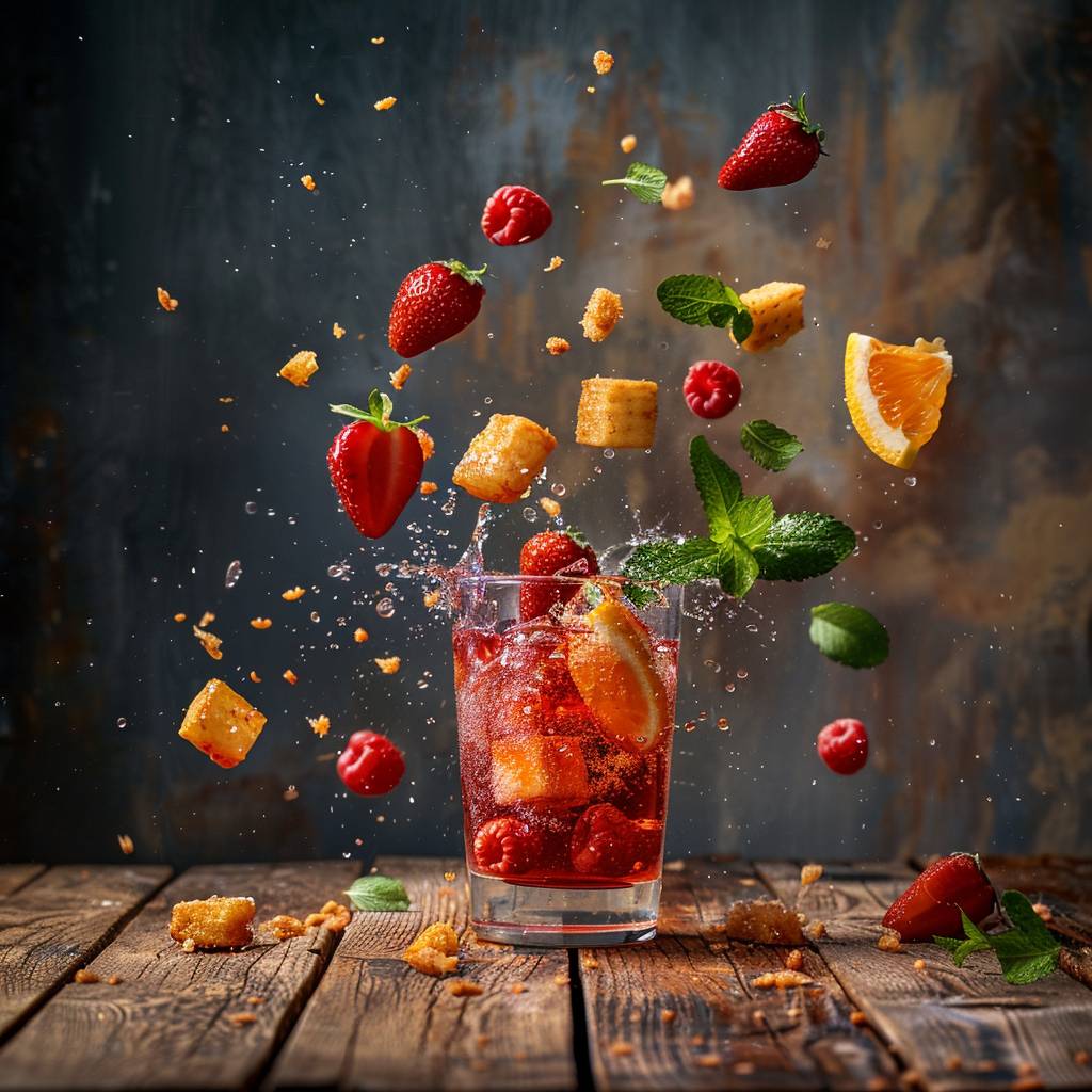 고품질의 음식 사진으로, 날아오르는 음료와 배경이 있으며, 글쓰기 공간이 제공된다.