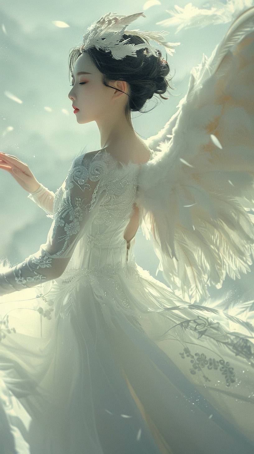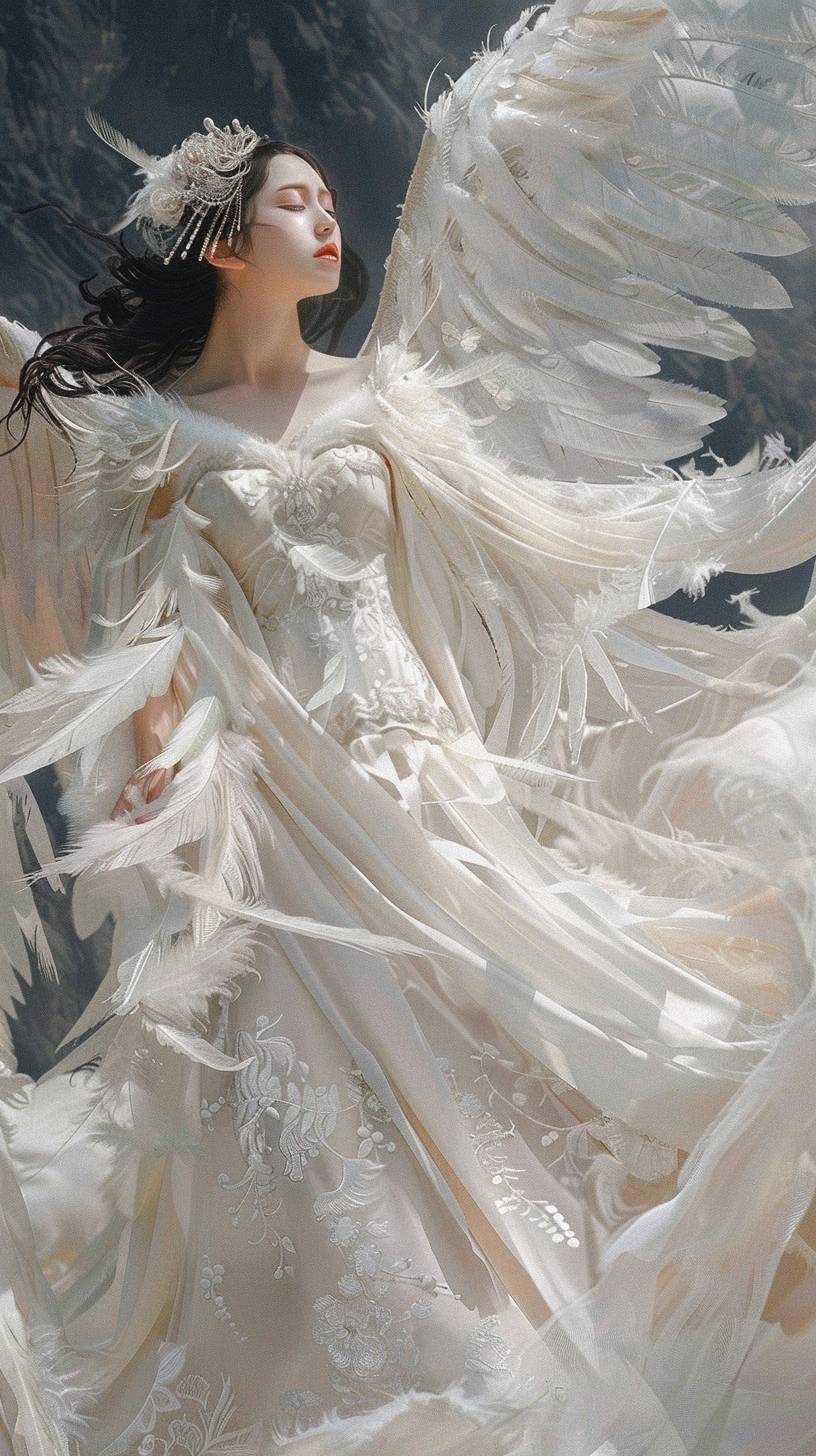 Realism Brutalism Minimalism A Chinese woman in a white wedding dress with a pair of feathered wings outstretched behind her back, fluffy flapping wings, styled as luminous and dreamy scene --ar 9:16 --v 6.0