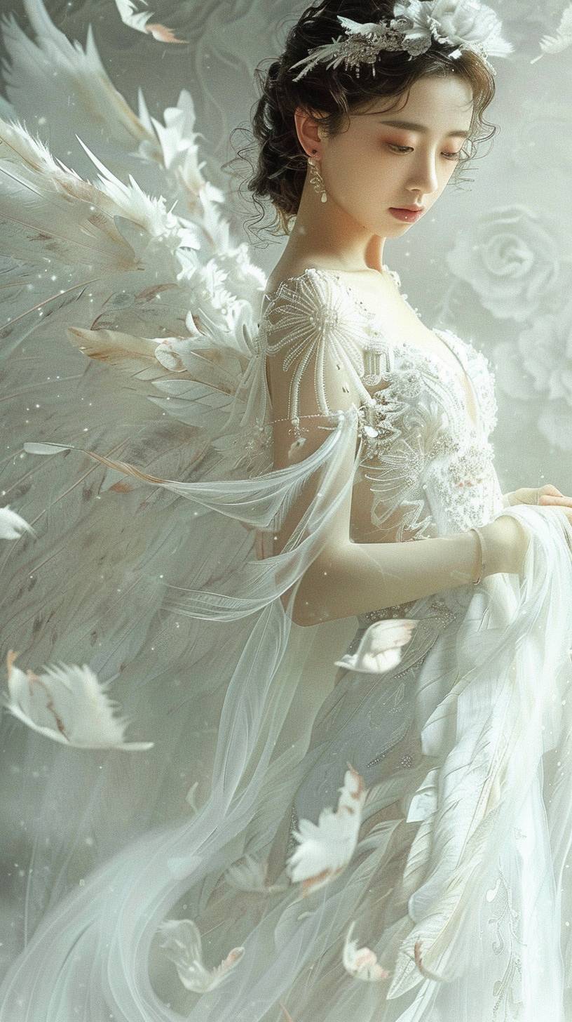 리얼리즘 브루탈리즘 미니멀리즘 하얀 웨딩드레스를 입은 중국 여성, 등 뒤에 펼쳐진 깃털 날개와 후드러뜨려 날리는 푹신한 날개, 빛나고 꿈같은 장면으로 스타일링