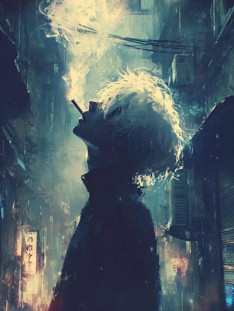 카메라를 향해 얼굴만 돌리고 노려보는, 그런지 애니메이션 스타일의 젊은 남자. 밤의 조용한 골목에서 닫힌 셔터 옆 벽에 기대어 담배를 피우며, 부드럽게 내뿜은 연기가 그의 입에서 천천히 떠오르고 있다. 외로운 분위기, 영화 같은 분위기, 4k.