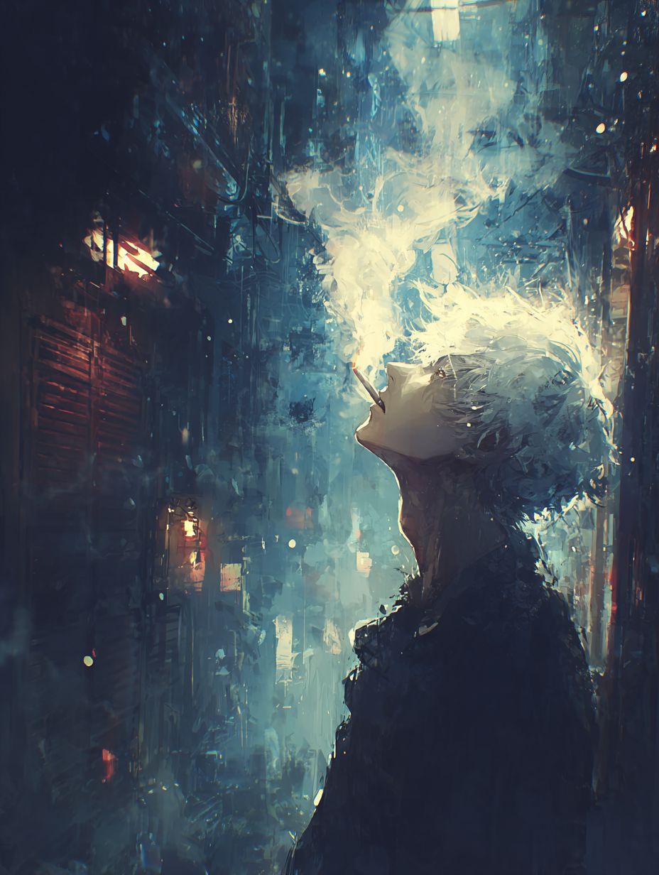 turning only his face toward the camera and glaring, grunge anime style, young man with silver-white hair smoking a cigarette by the wall of a quiet alley with closed shutters at night, soft exhaled smoke drifting gently from his mouth, lonely atmosphere, cinematic mood, 4k --ar 3:4 --profile noeiyk9 njuwkc4 lji1xcm --v 7.0