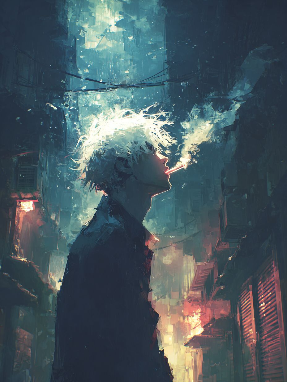 은백색 머리의 젊은 남성이 조용한 골목의 벽에 기대어 담배를 피우고 카메라를 바라보며 외로운 분위기를 자아낸다