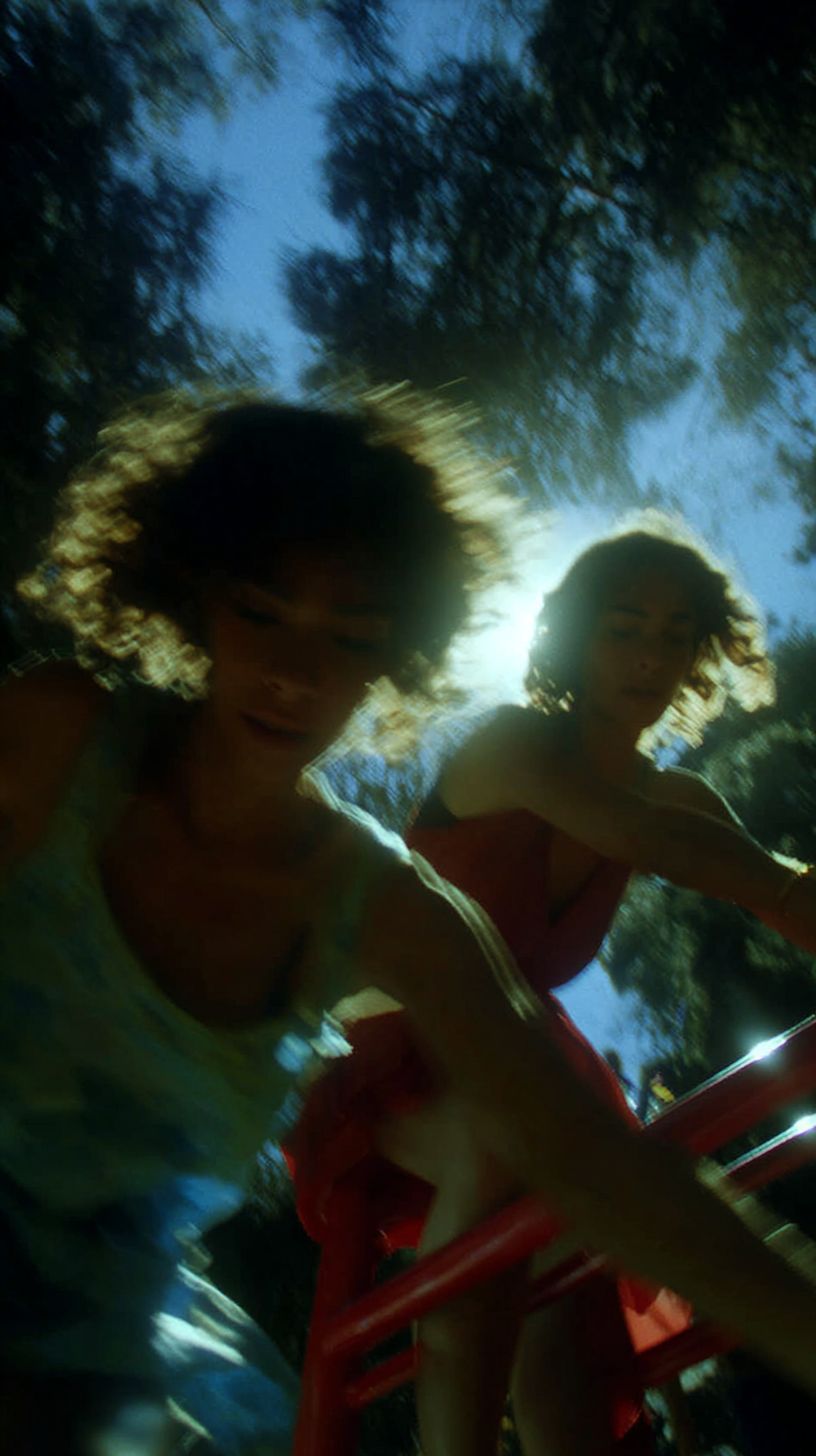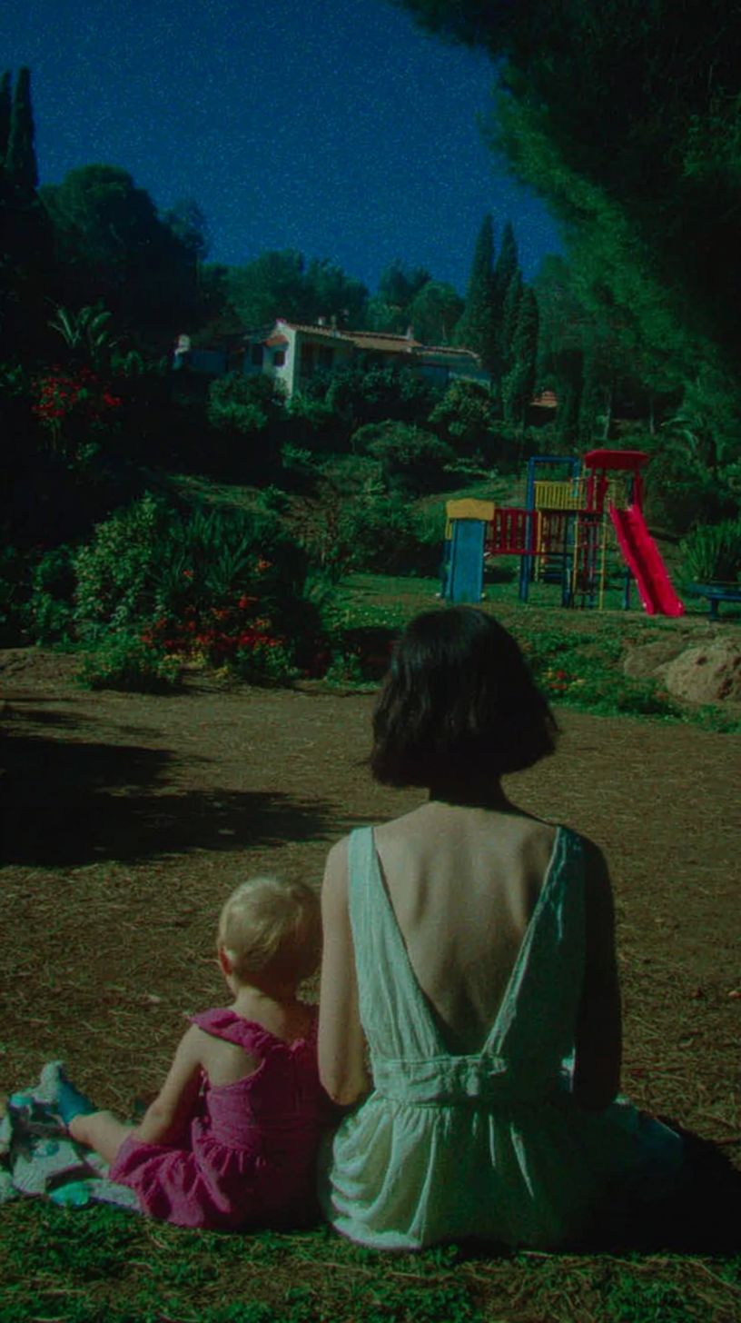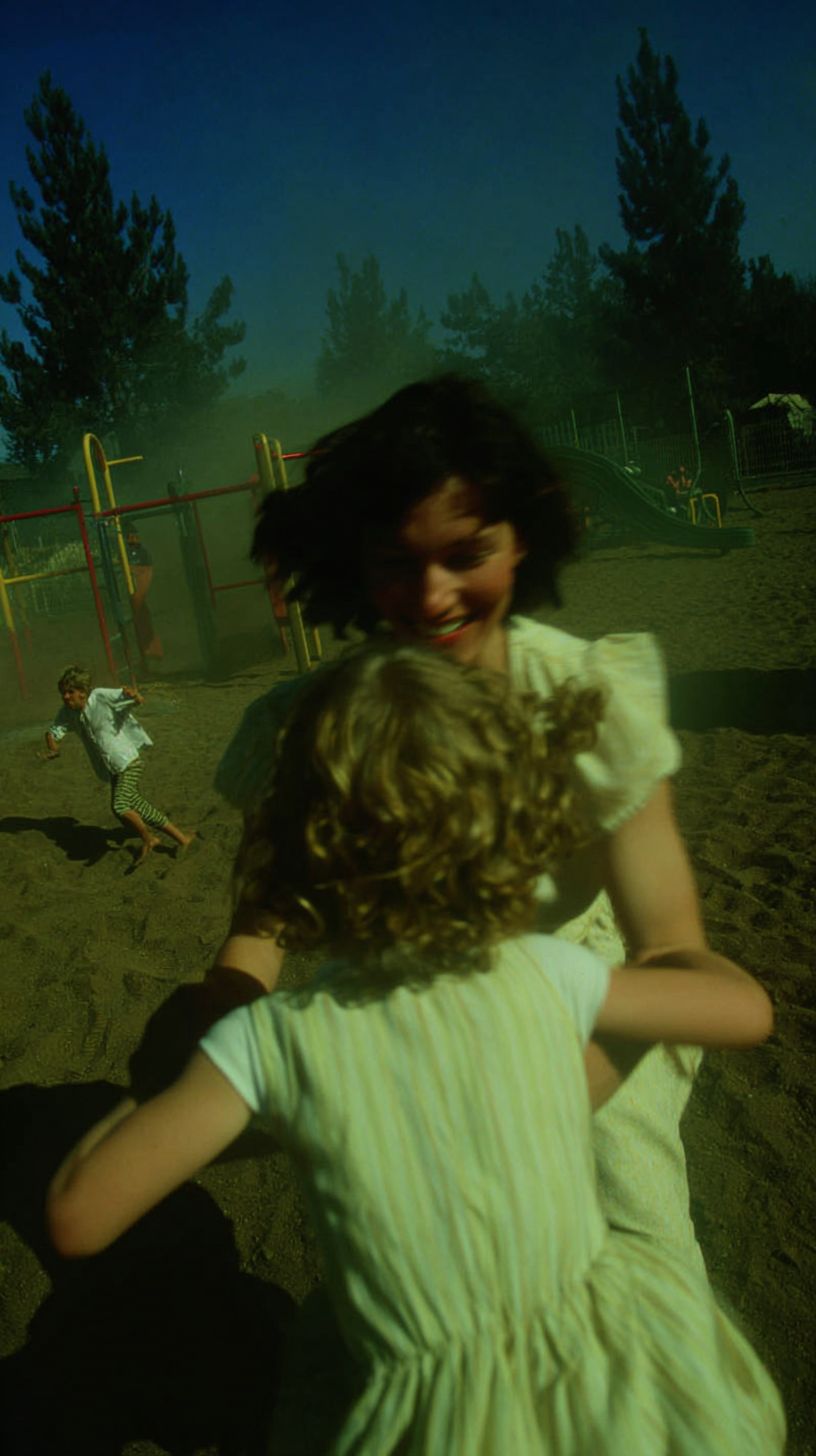 두 명의 어머니와 그녀들의 아이들이 스페인 공원의 놀이터에서 놀고 있습니다