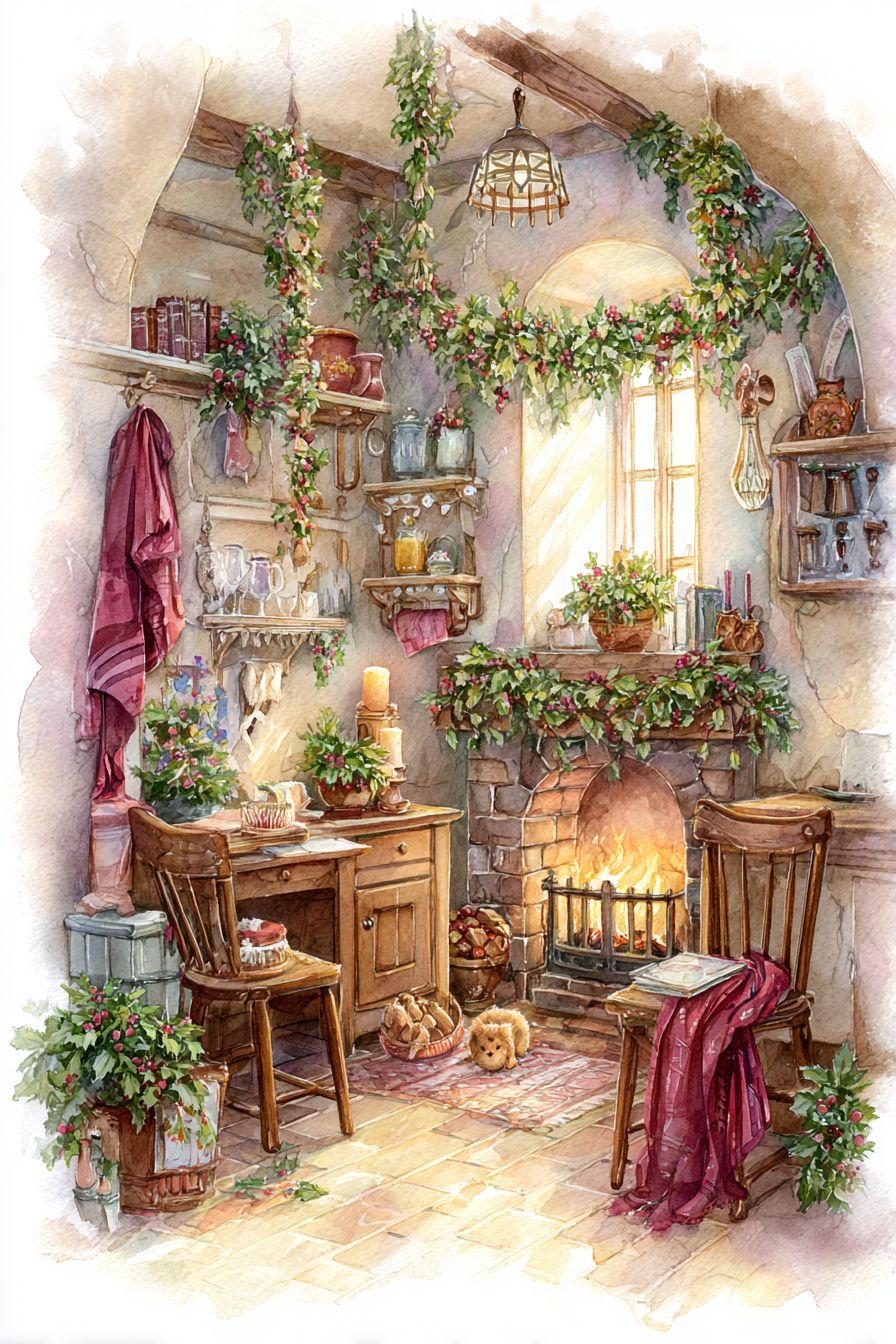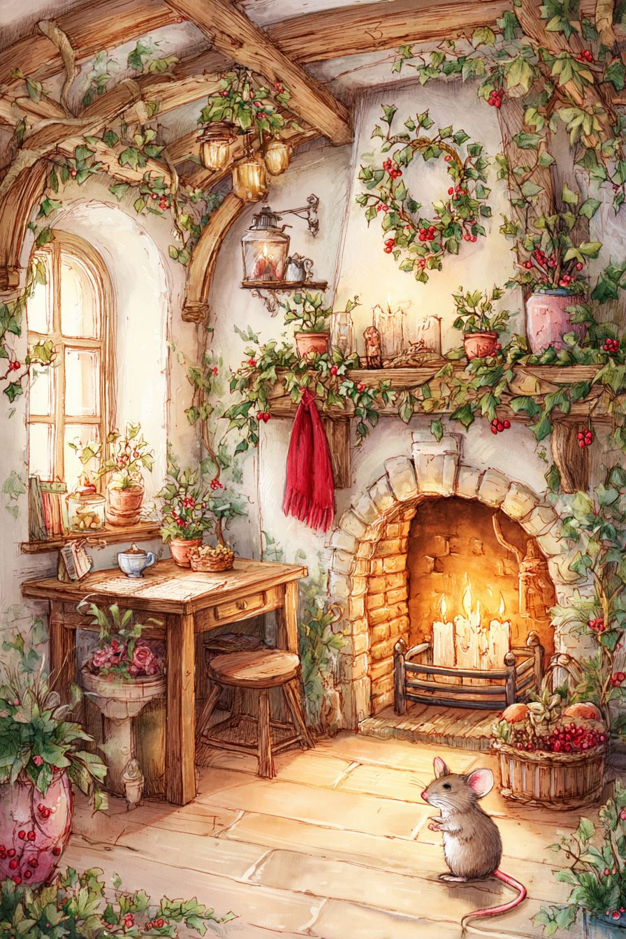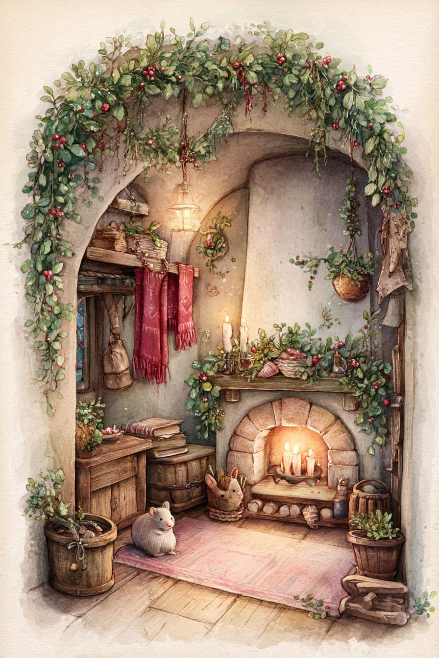 수채화의 기발한 스타일, 크리스마스 장식이 되어 있는 작은 쥐 집의 내부, 빛나는 벽난로, 홀리와 아이비의 화환, 말린 빨간 스카프, 따뜻한 촛불의 빛과 소박한 나무 가구, 부드러운 그림자와 화가의 세부 사항, 부드러운 축제의 빛, 전통적인 크리스마스 색상.