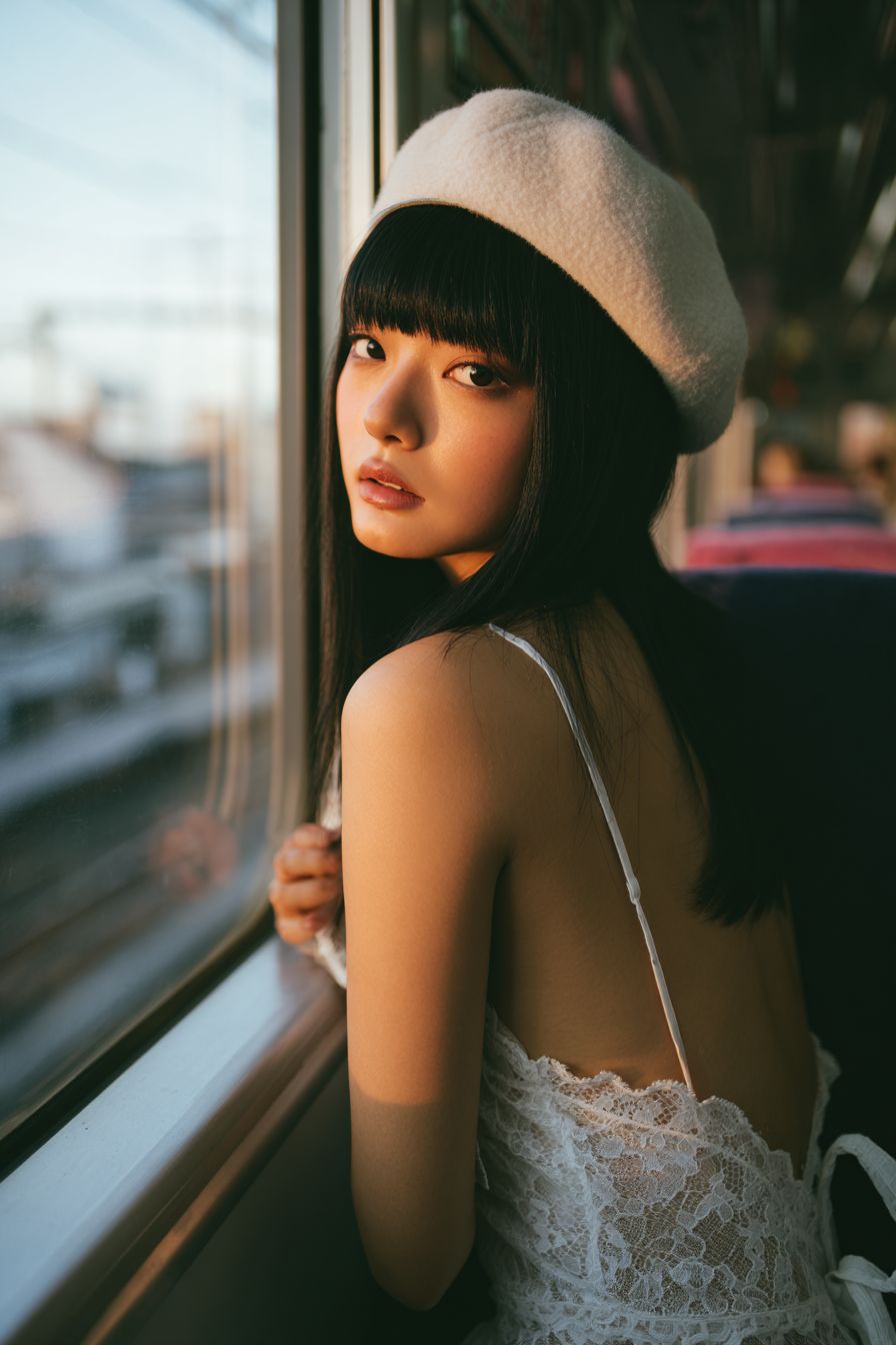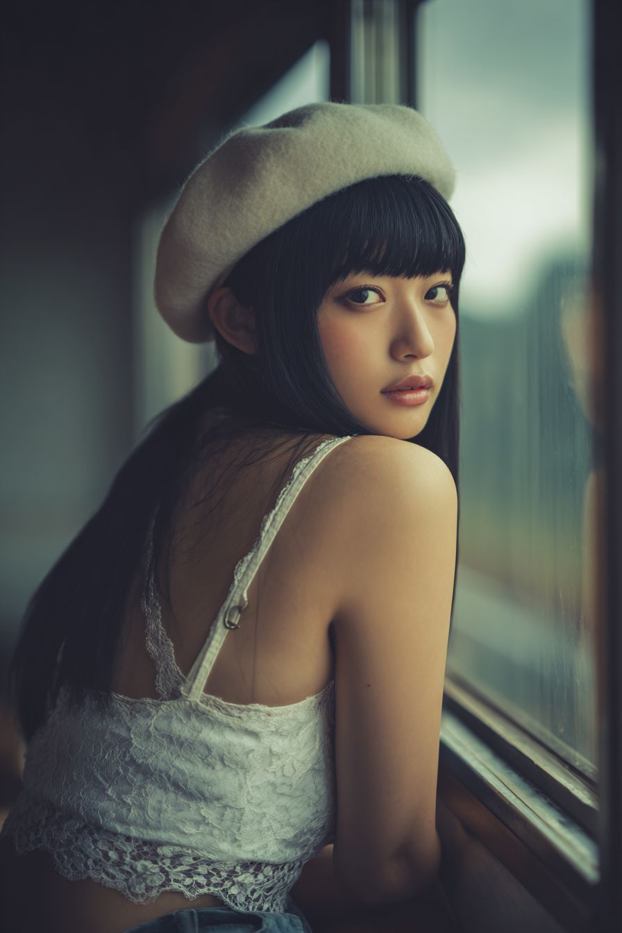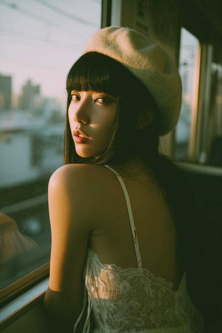 젊은 일본 미인이 기차 창가에 앉아 카메라를 향해 잔잔하고 약간 먼 표정으로 뒤돌아보고 있습니다. 창문을 통해 부드러운 일몰 빛이 들어오고 따뜻한 색조가 감돕니다. 그녀는 백색 레이스 캐미솔을 입고 등 부분이 드러나 있으며, 매끄러운 피부와 긴 직모의 검은 머리카락에 무거운 앞머리를 하고 밝은 색의 베레모를 썼습니다. 창 밖의 풍경은 흐릿하고 유리에는 약간의 반사가 있습니다. 영화 같은 촬영 스타일, 미세한 필름 그레인, 미세한 필름 질감, 부드러운 초점, 얕은 심도, 따뜻한 분위기, 향수를 불러일으키는 기분. 초현실적인 초상화 사진, 85mm 렌즈, F1.4, 부드러운 조명, 높은 세부 사항.