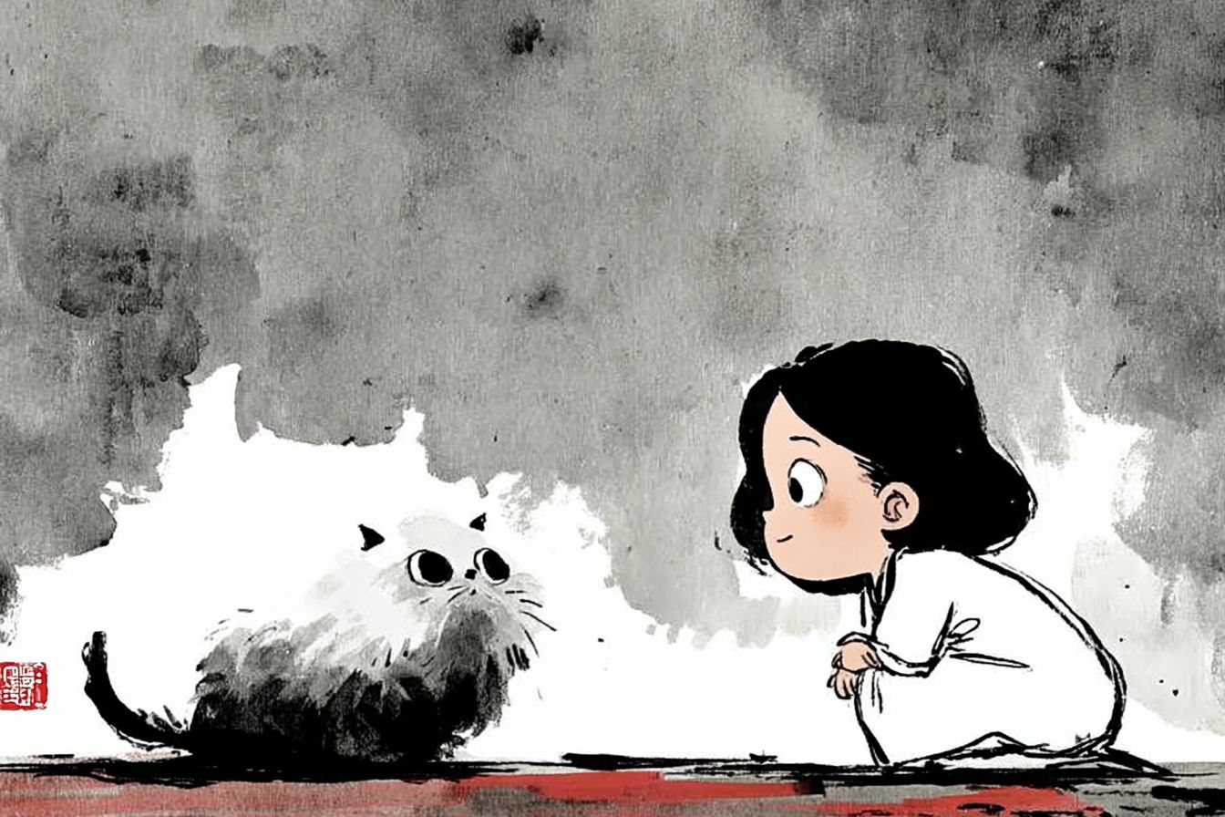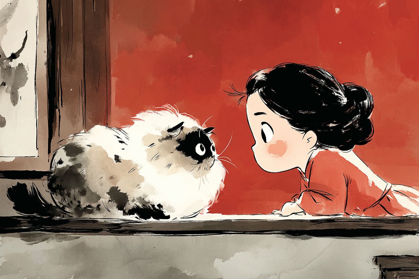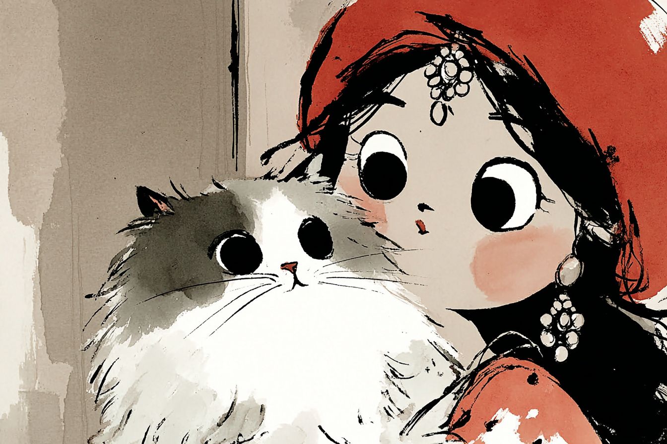 A young beautiful girl and a cute fluffy cat --sref 2427237502 --ar 3:2