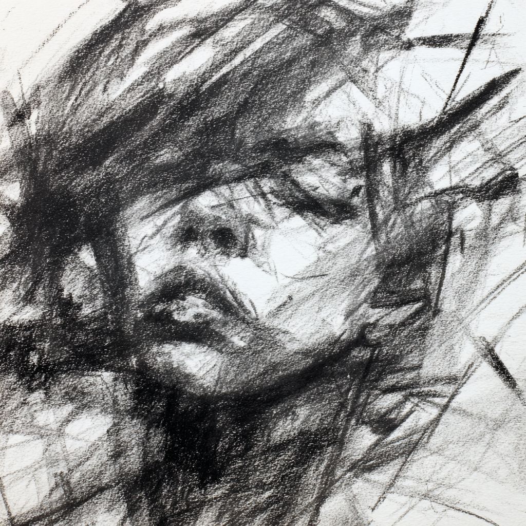여자아이의 목탄 연필 스케치, 역동적인 흐림과 그래파이트 자국이 드러난 예술적 효과