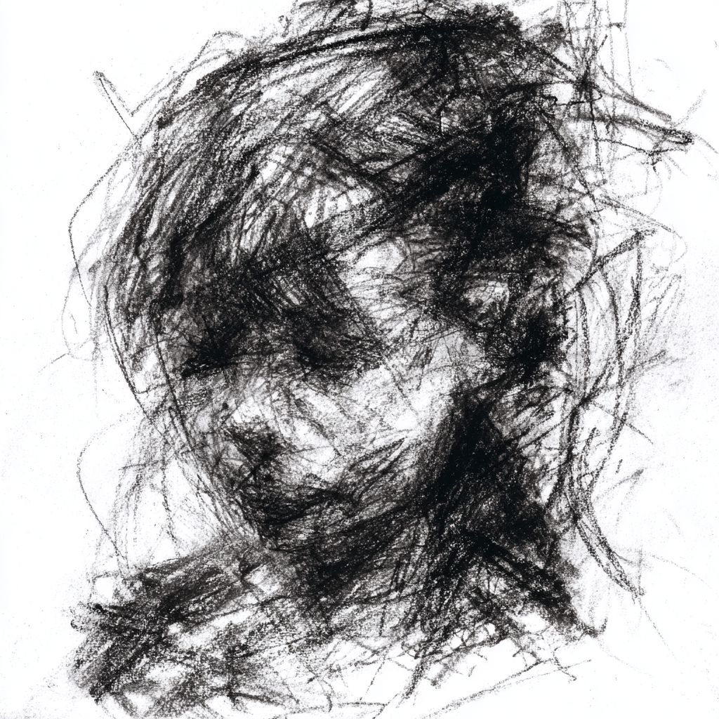 소녀의 목탄 연필 스케치, 혼란스럽고 표현적인 스트로크, 역동적인 번짐과 랜덤 그래파이트 자국, 인상파 손으로 그린 스타일, 가시적인 모션 블러 및 블렌딩, 예술적인 혼란스러움, 고대비 음영, 미니멀한 구성