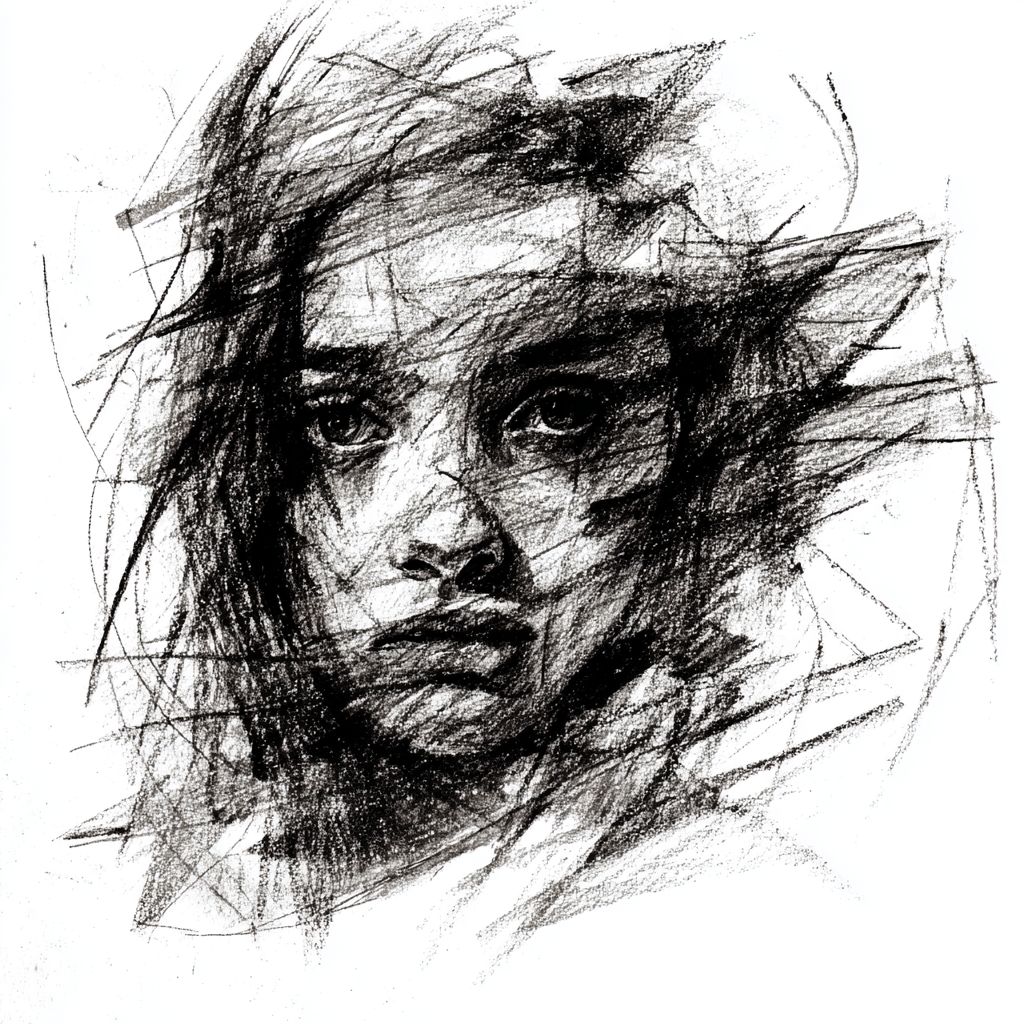 charcoal pencil sketch of a girl, chaotic expressive strokes, dynamic smudges and random graphite marks, impressionistic hand-drawn style, visible motion blur and blending, artistic messiness, high-contrast shading, minimalist composition --v 7.0 --p 78soi4x --s 50
