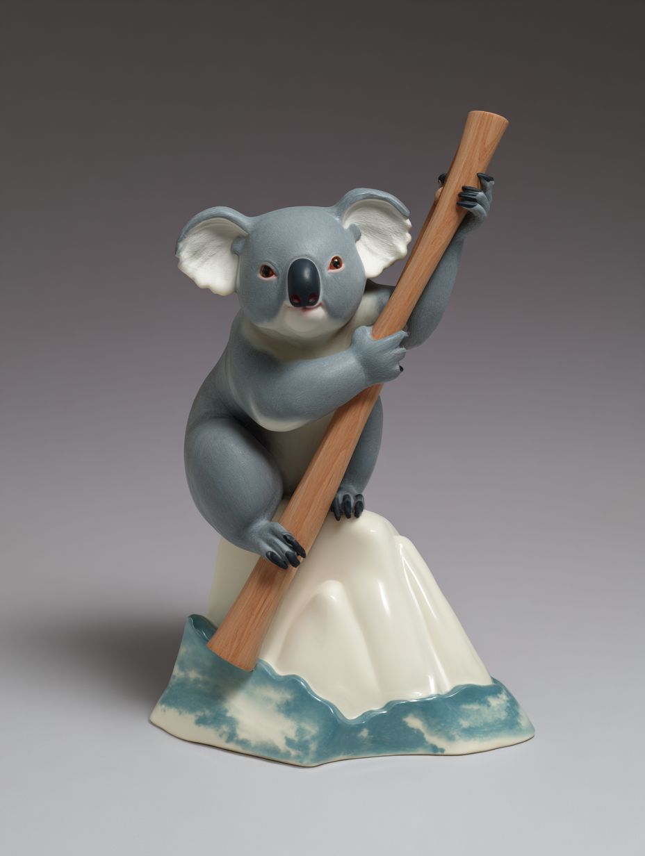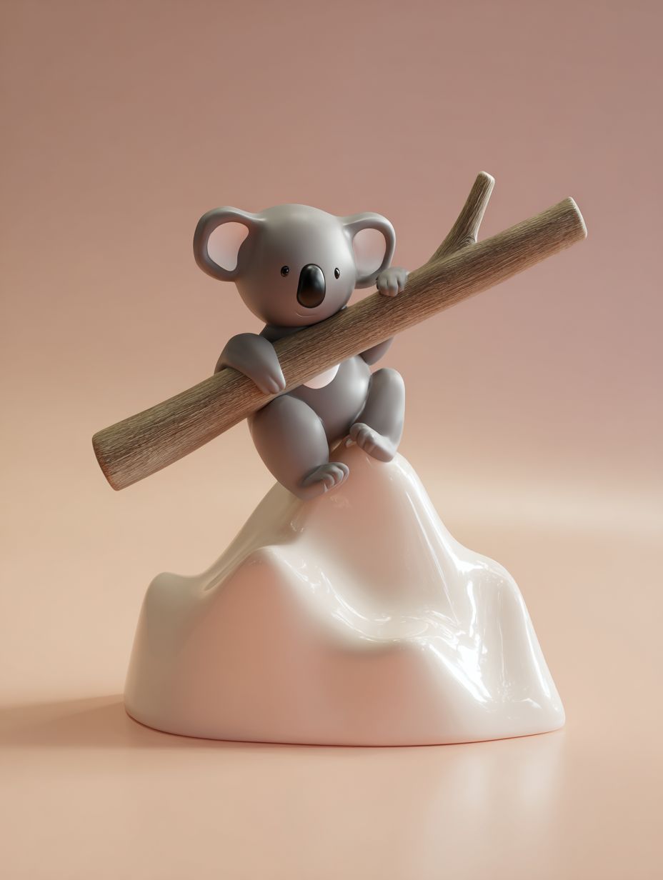 Contemporary art figurine of a koala clinging to a short wooden branch. The branch is cleanly cut on both ends and mounted horizontally on a base shaped like a small terrain mound, a stylized miniature hill with smooth, modern contours. The entire scene is a sculpture displayed on its own stand. Original artistic style with bold, modern shapes, smooth stylized surfaces, and a slightly abstract interpretation. Soft matte materials, harmonious color palette, gallery-style lighting, high-detail studio render. --ar 3:4 --v 7.0 --p 78soi4x --s 50