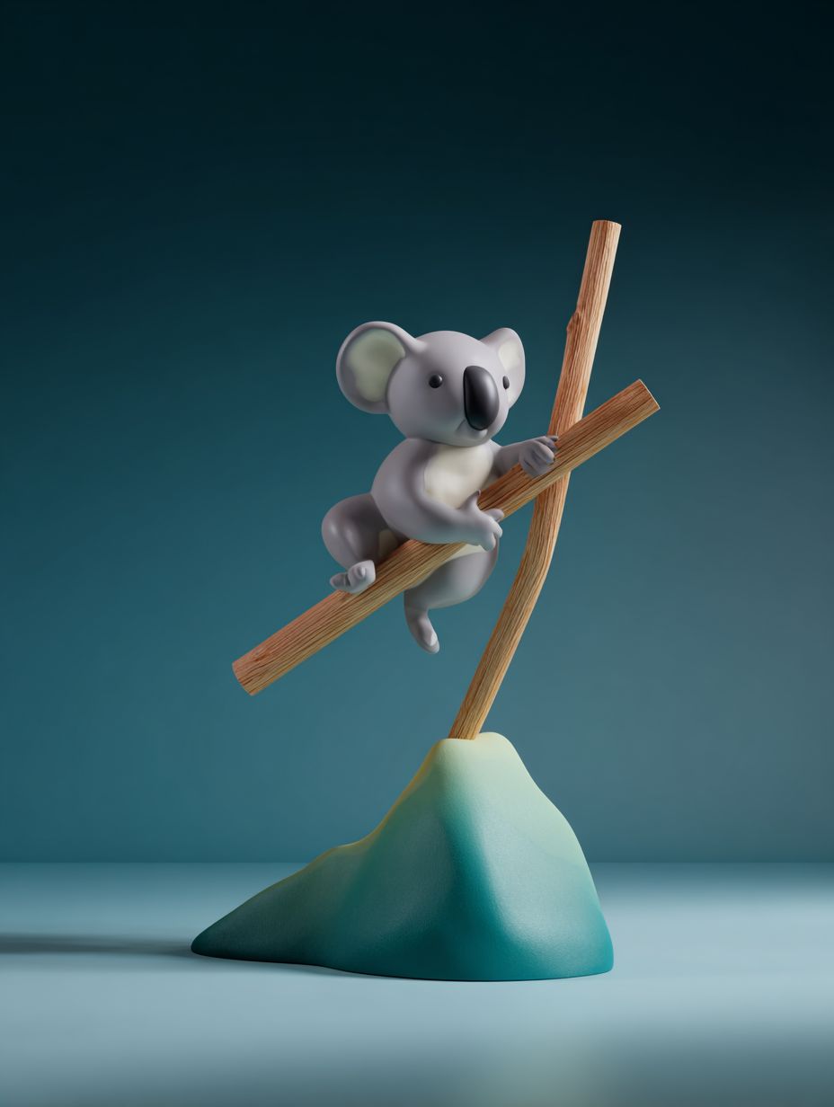 현대 미술 피규어, 짧은 나무 가지에 매달려 있는 코알라. 가지의 양 끝은 깔끔하게 잘려 있으며, 작은 지형 언덕처럼 생긴 바닥에 수평으로 장착되어 있습니다. 전체 장면은 독립적으로 전시된 조각입니다. 독창적인 예술 스타일로 대담하고 현대적인 형태, 매끄러운 스타일화된 표면, 약간 추상적인 해석을 가지고 있습니다. 부드러운 매트 재질, 조화로운 색조, 갤러리 스타일의 조명, 고해상도 스튜디오 렌더링.