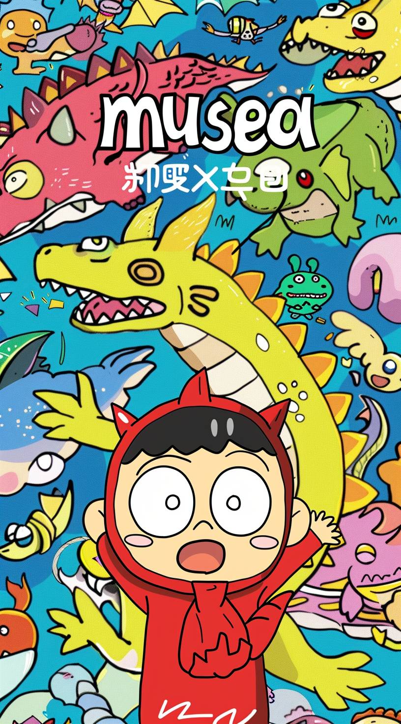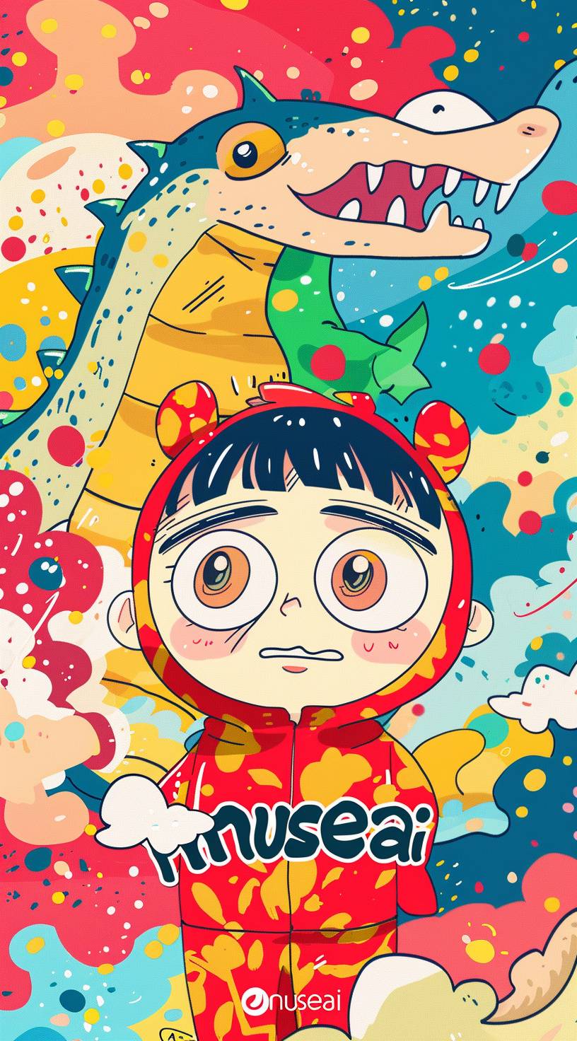 크레용 신짱이 'musesai'라는 글씨가 적힌 빨간색 드래곤 의상을 입고, 다채로운 배경 속에서 간단한 선 그림 스타일과 컬러풀한 만화 캐릭터의 귀여운 표정을 통해 귀여운 분위기를 만들고 있다.