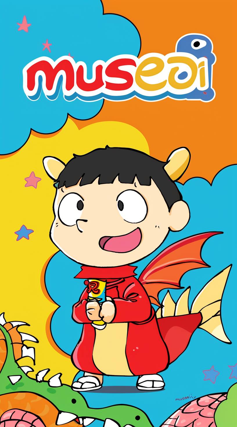 짱구가 'musesai'라는 글자가 적힌 빨간 드래곤 의상을 입고 있으며, 만화 삽화 스타일로, 다채로운 배경과 함께, 간단한 선화로 그리고 다채로운 만화 캐릭터를 사용하고, 굵은 선과 단색으로, 색상 포화도가 높으며, 간단한 디테일을 유지하고, 만화에서 귀여운 표정을 지어, 귀여운 분위기를 만들며, 만화 스타일로 표현되어 있습니다.