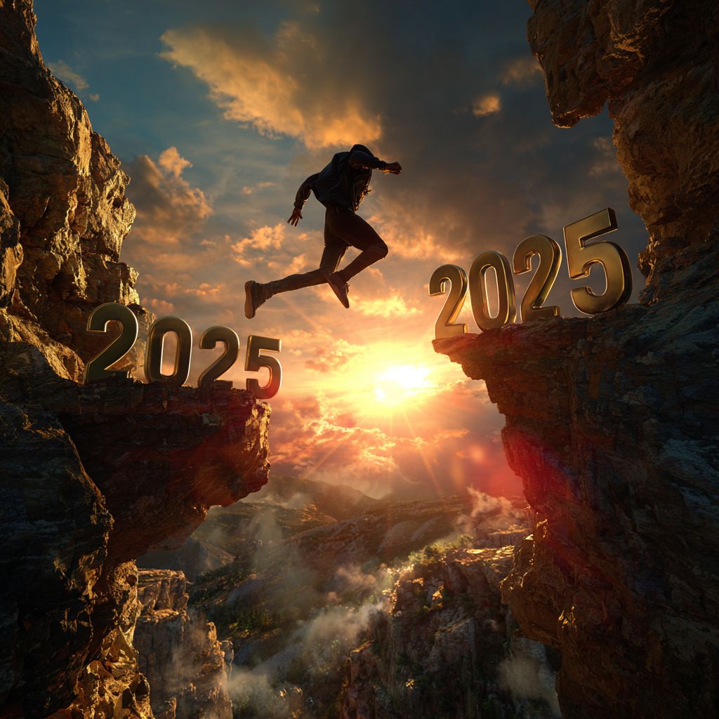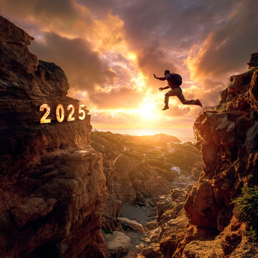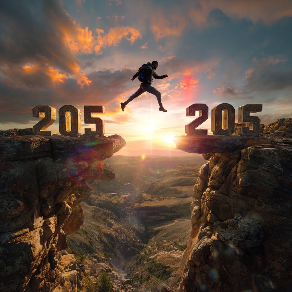 silhouette of a man jumping from cliff with "2025" numbers to another cliff with "2026" numbers, wide landscape shot, dramatic sunset, warm golden hour lighting, sun flare behind the jumper, photorealistic scene, high-detail rocky cliffs, soft cloudy sky, inspirational mood, dynamic action pose, ultra sharp, high resolution, professional stock photography style, no logos, no watermark --v 7.0 --p 78soi4x --s 50