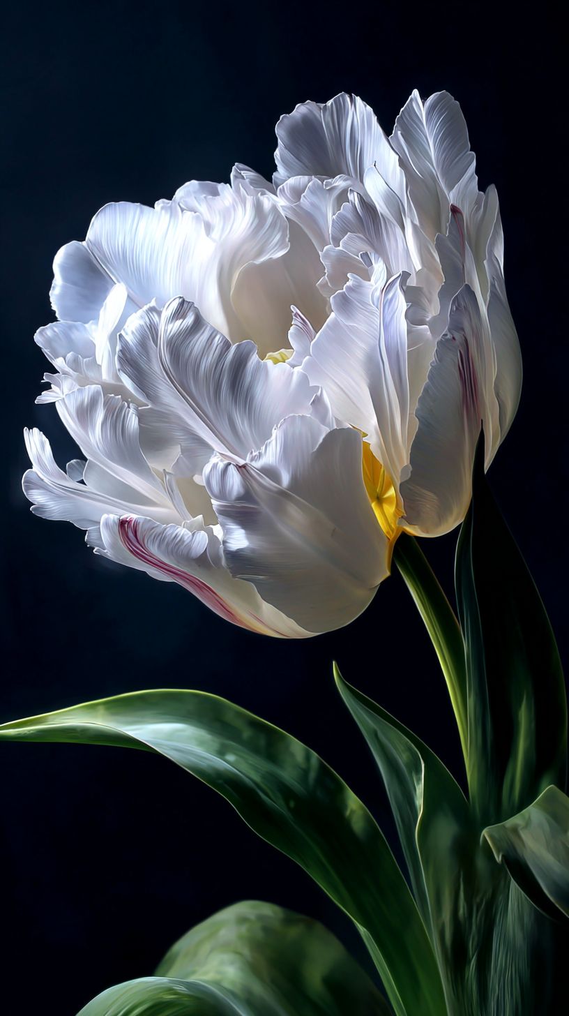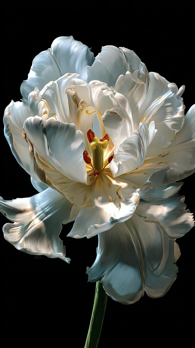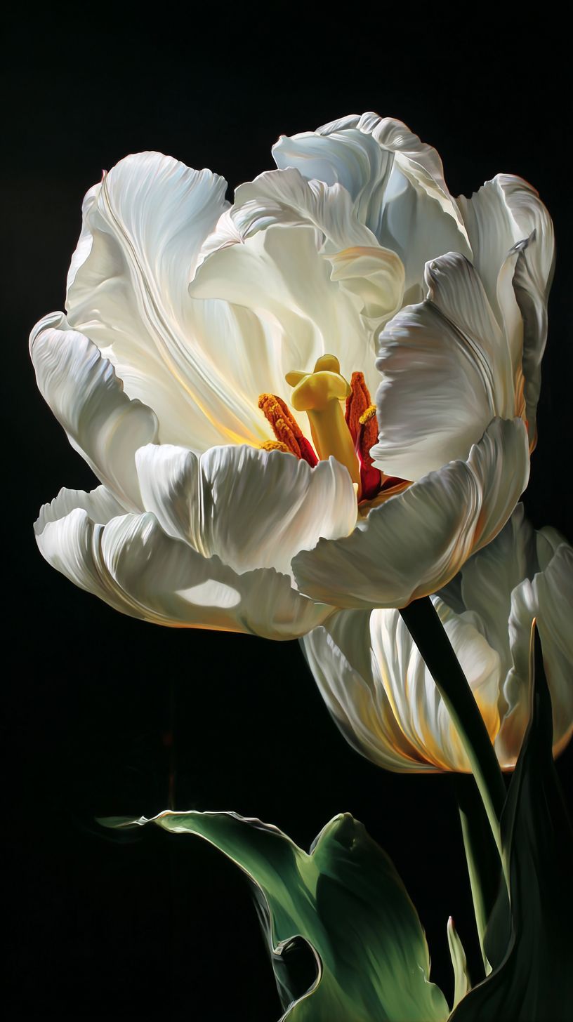 A white tulip, hyper realistic, close up on the black background --ar 9:16 --v 7.0 --p 78soi4x --s 50