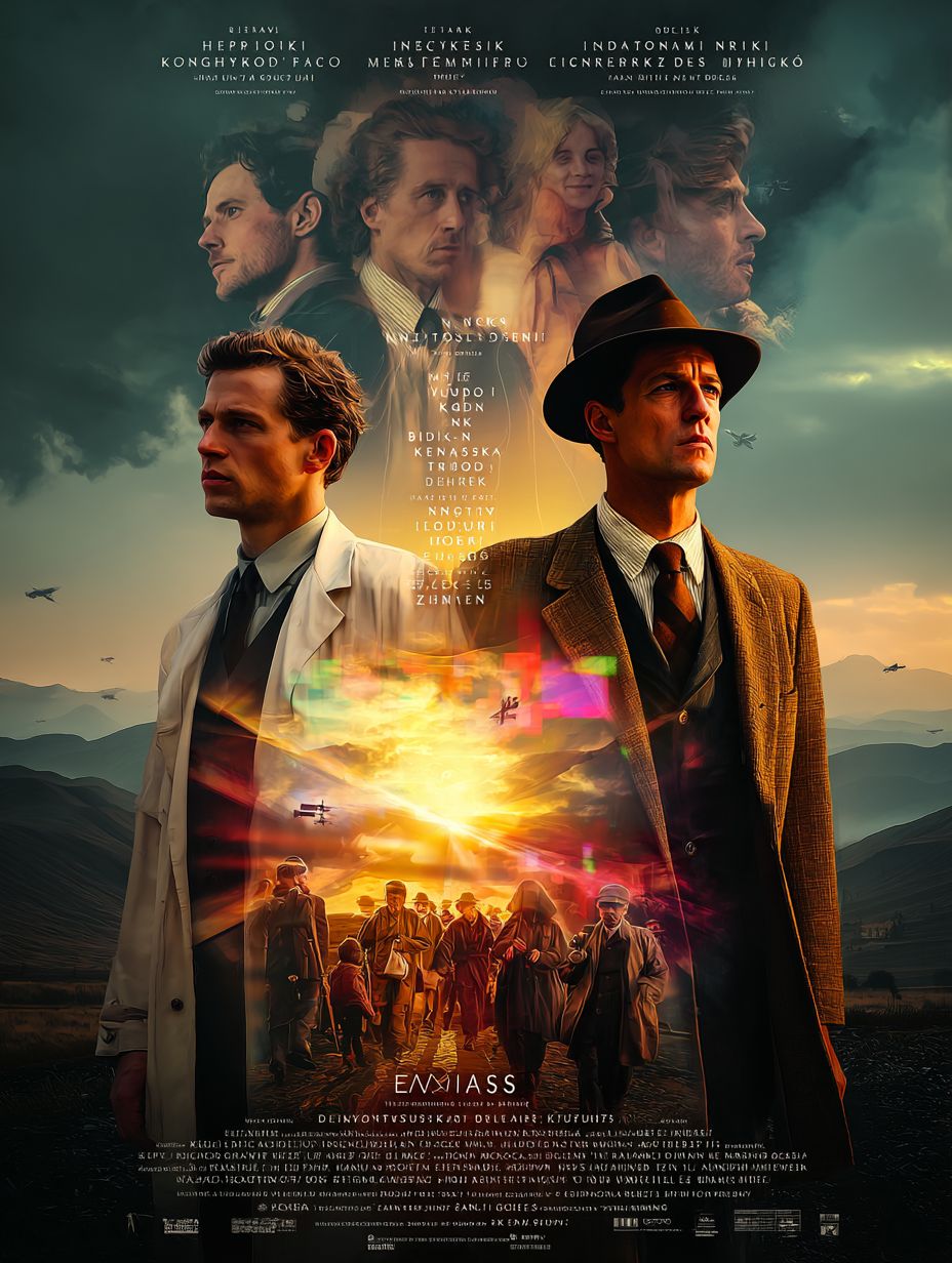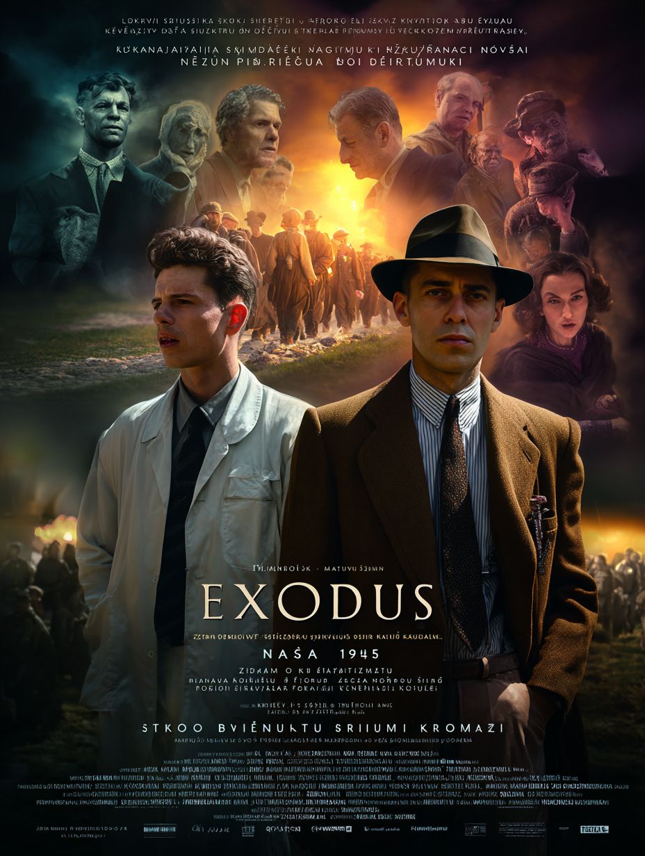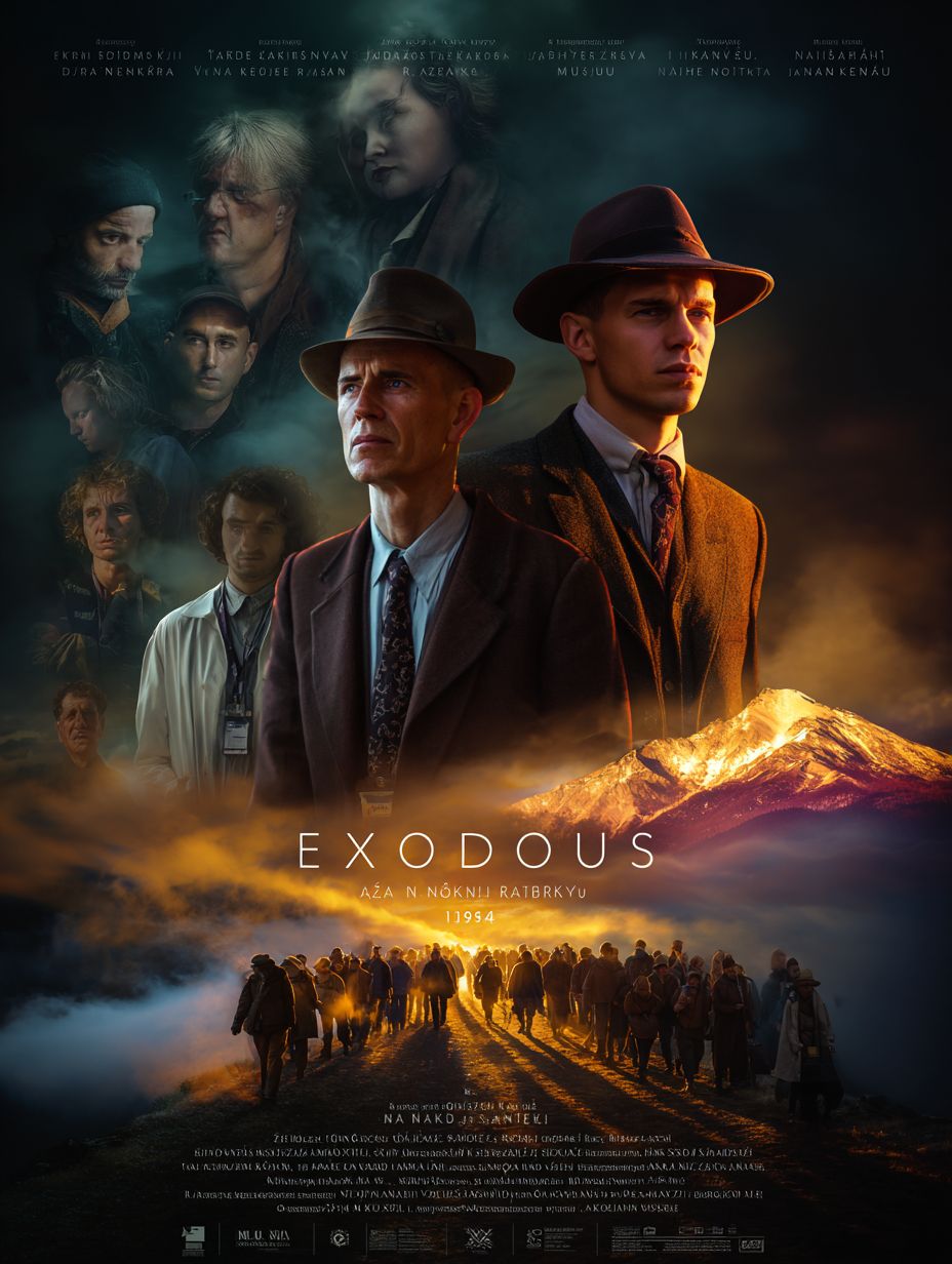 Style: epic historical drama poster, inspired by the poster compositions in the reference PDF; painterly realism, cinematic lighting, layered character montage, sharp readability, emotionally uplifting atmosphere. Prompt: "Create an epic historical movie poster set in 1945, with a black background that gradually opens into warm, hopeful light behind the characters. In the foreground, two men stand side by side with quiet determination: • On the right: a 50-year-old man wearing a brown suit and dark fedora hat, his expression weary yet dignified, carrying a sense of renewed resolve. • On the left: a 30-year-old doctor in a white medical coat and dark tie, sharp featured, tense yet hopeful, representing compassion and courage. Behind them, compose a layered cinematic collage of supporting characters--faces emerging softly from the darkness into light, suggesting unity and resilience rather than despair. Behind these figures, show a long line of refugees walking toward distant sunlit mountains, symbolizing the 1945 exodus but framed as a journey toward safety and renewal. Use soft fog, warm highlights, and gentle backlighting to create an uplifting emotional tone. Integrate the provided title artwork ‘EXODUS 1945 NAŠA KRI’ in the center of the composition, large, highly readable, elegant, blending harmoniously with the scene. The title should feel like a premium, metallic-textured, prestigious film logo, subtly catching the warm light. Mood: uplifting, solemn yet hopeful, emotional, painterly, historically grounded; a sense of perseverance and forward movement. Lighting: cinematic rim light with warmer accents, soft diffusion in the background, gentle color grading in cool blues balanced with rising golden tones. Do not distort the characters; avoid fantasy elements; [...]