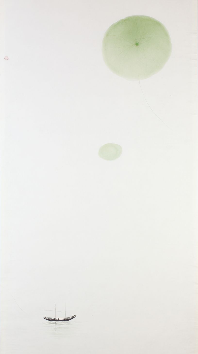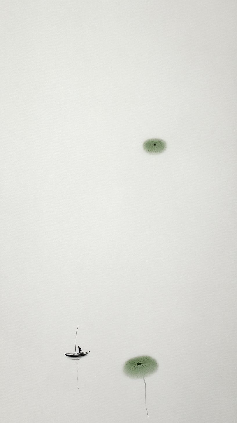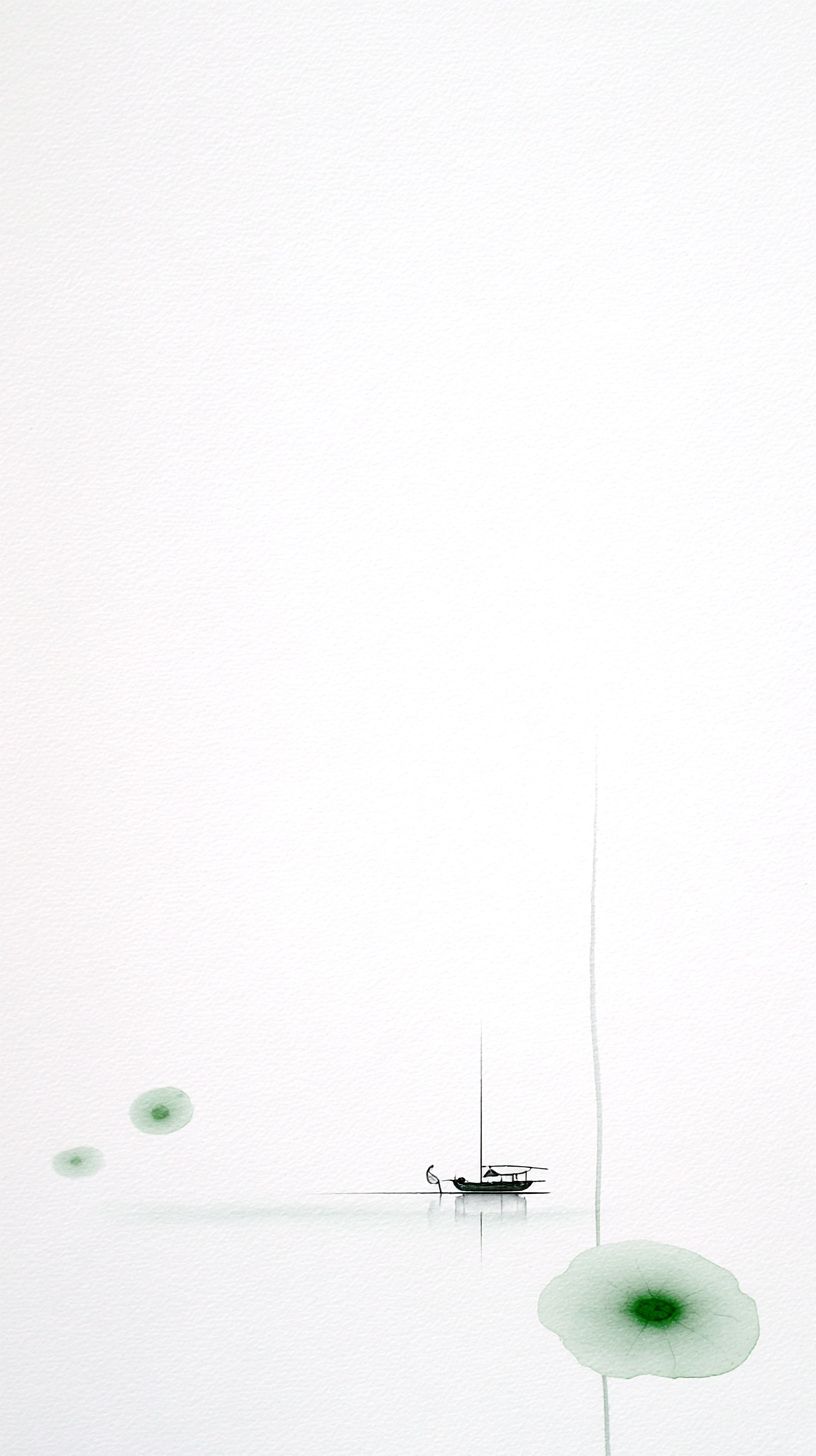 미니멀리스트 중국 수묵화, 9:16 구성, 98%의 광활한 백색 공간, 모든 장면 요소가 하단에 미니어처 스케일로 축소, 연한 녹색 부드러운 잉크 안개가 세 개의 작은 원형 언덕 그림자를 형성하고, 초가느다란 줄기를 가진 미니멀한 연꽃 잎, 보트는 서브 픽셀 잉크 자국으로 줄어들어, 겨우 감지할 수 있는 미세한 짧은 선, 거의 보이지 않는, 희미한 잔물결과 함께, ethereal 강남 분위기, 부드러운 녹색 수묵, 초미니멀한 우아함.