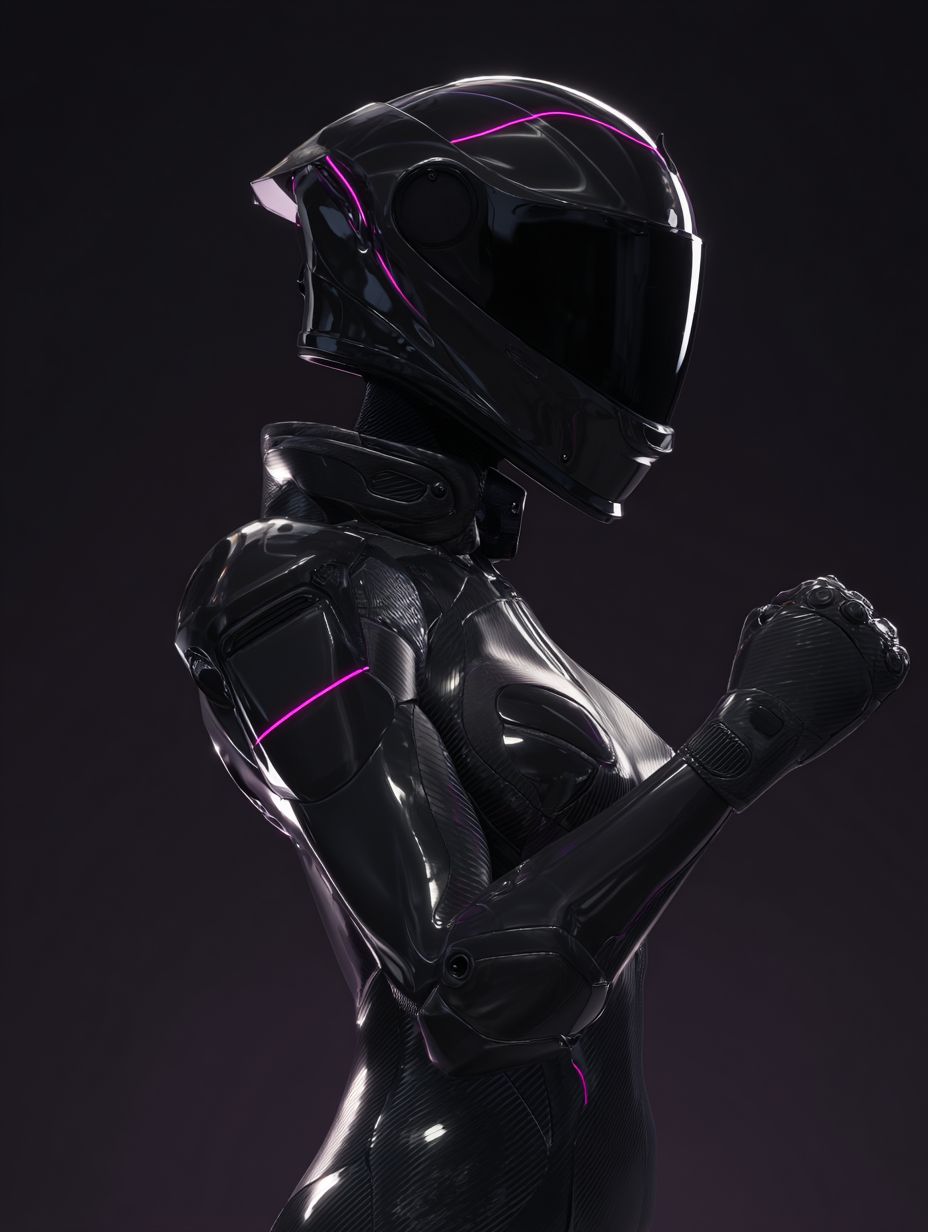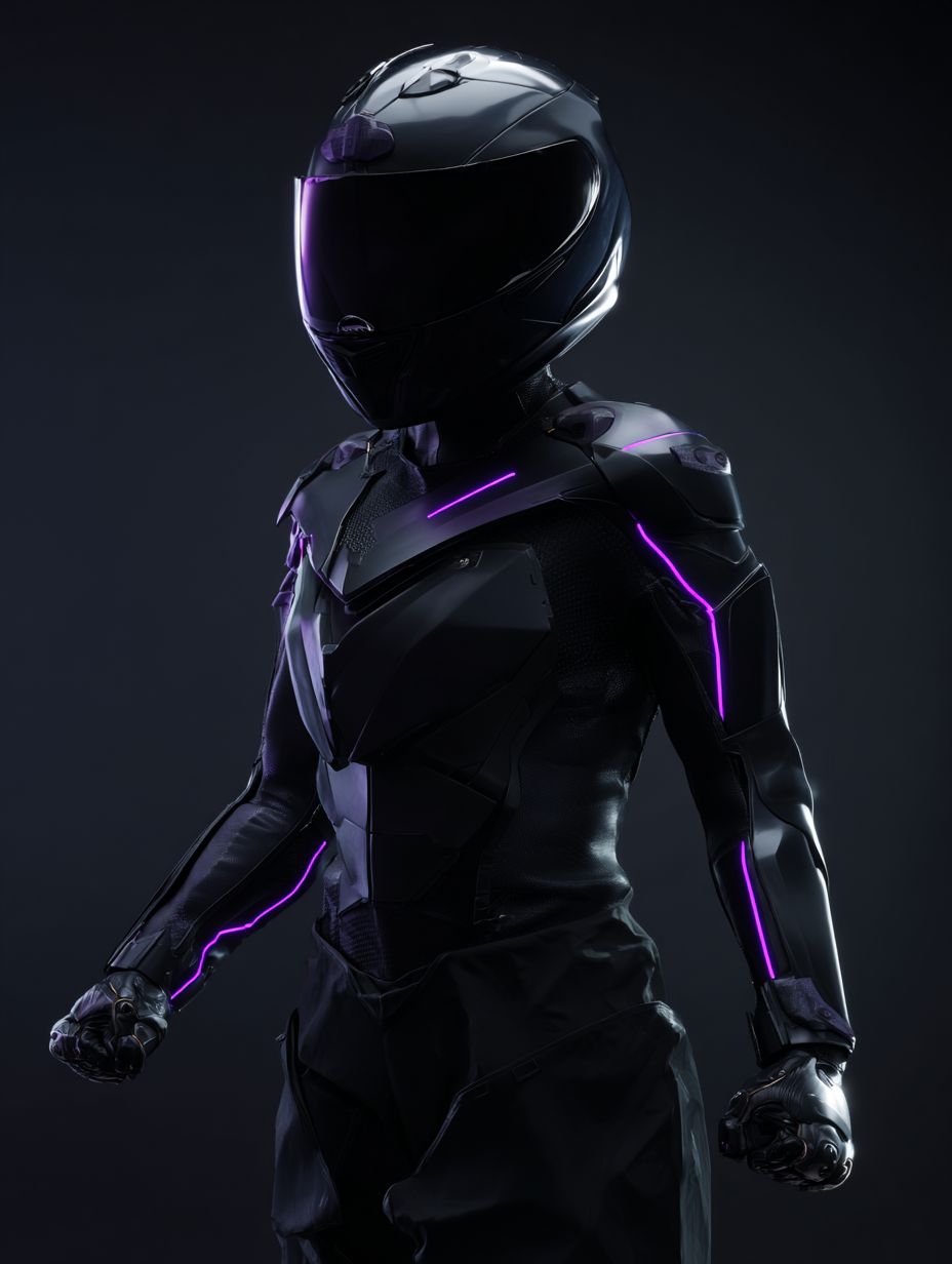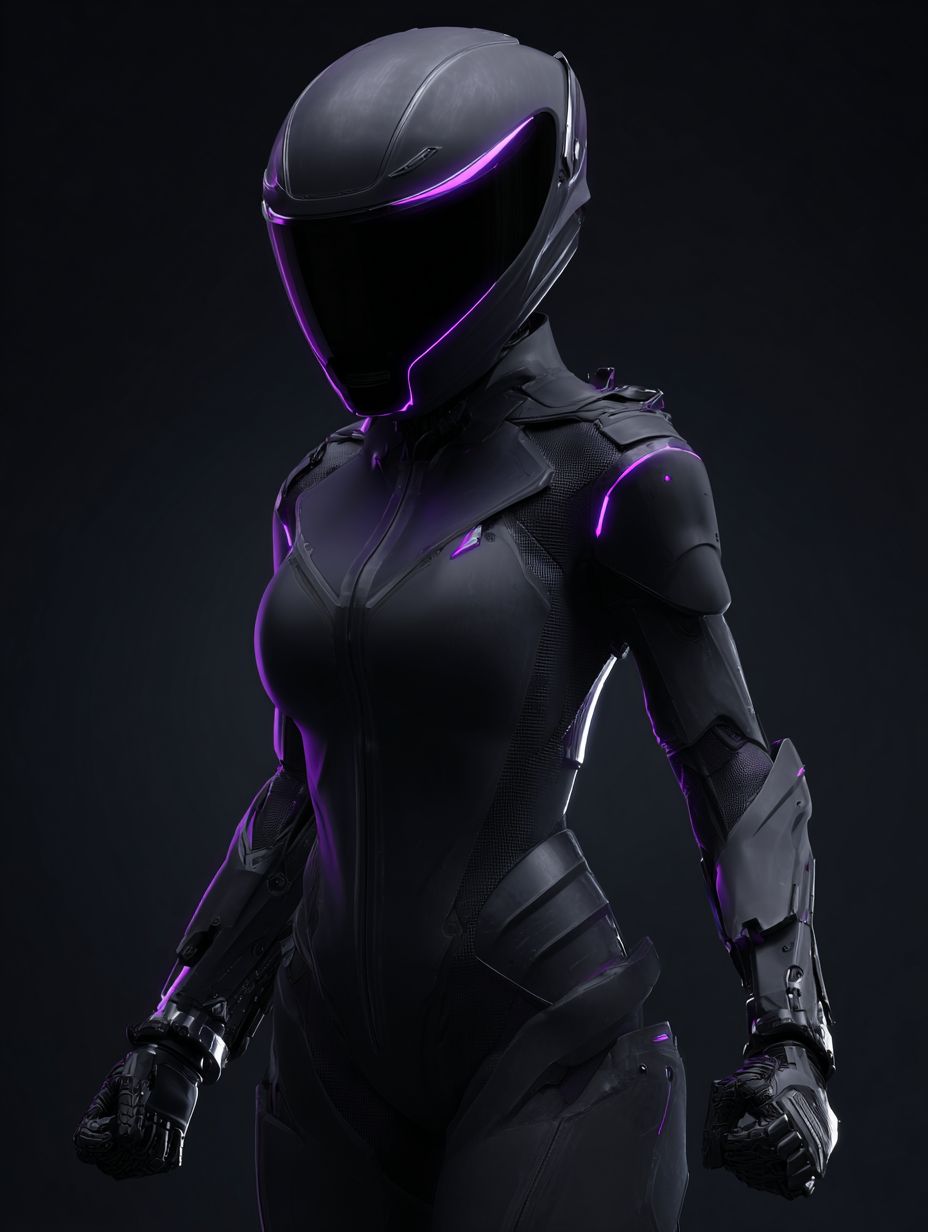 모터사이클 풀페이스 헬멧을 착용한 미래형 인간 여성, 매끄러운 검은색 외골격 슈트, 오른쪽 앞보기에서 자신감 있게 서 있으며, 주먹을 쥐고 편안한 팔을 하고 있다. 슈트와 헬멧을 가로지르는 미세한 보라색 빛나는 선, 깨끗하고 매끄러운 갑옷 표면, 눈에 띄는 로고나 텍스처가 없으며, 단순한 어두운 배경, 영화 같은 조명, 부드러운 그림자, 현대 SF 미학, 미니멀리즘 디자인, 반짝이지 않는 고대비, 편집 구성, 현실적인 비율.