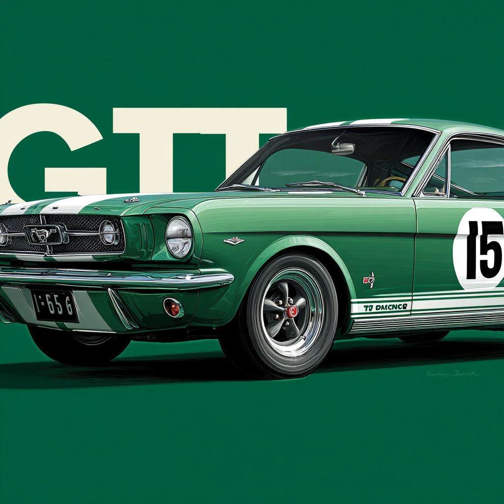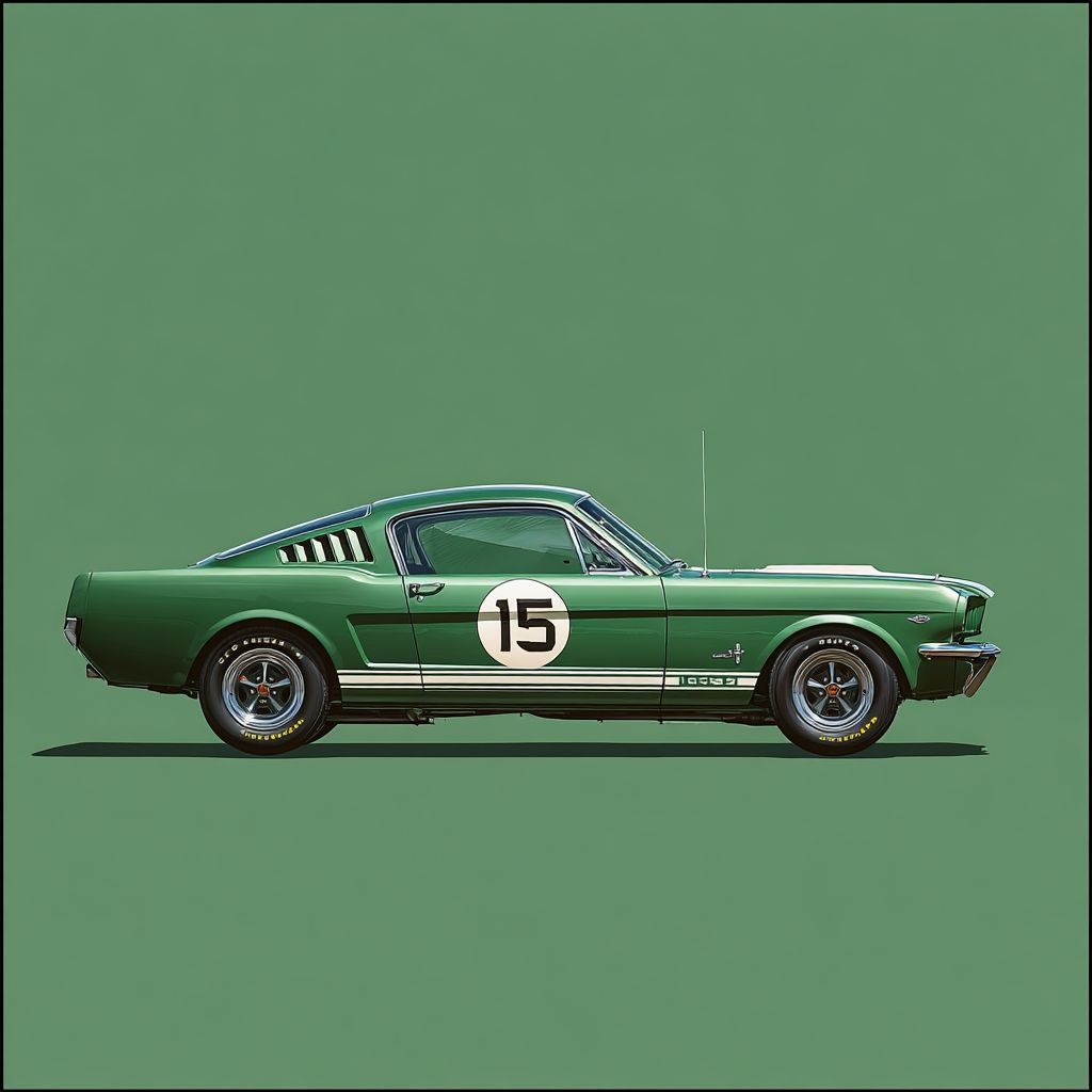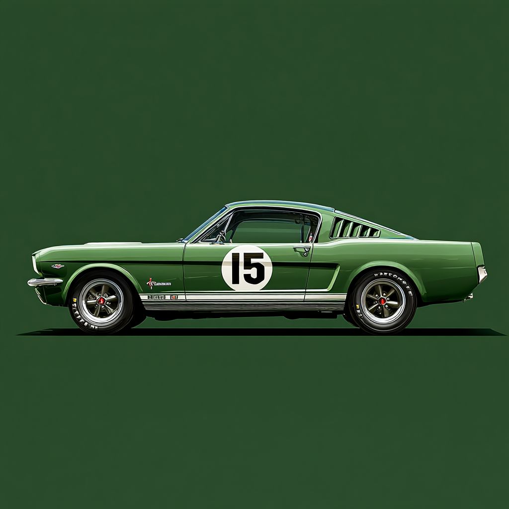 아이비 그린 1966년형 포드 머스탱 GT로, 흰색 록커 패널 스트라이프와 측면에 '15'라는 숫자가 있습니다. 차량은 올-그린 배경에 놓여 있어 차량의 디자인 세부 사항과 색 구성표를 강조하는 뚜렷한 대비를 만듭니다. 이 일러스트는 클래식 레이싱카의 본질을 포착하며, 매끈한 실루엣과 강력한 존재감을 강조하고, 1960년대 빈티지 자동차 경주 포스터 스타일로 고해상도로 표현됩니다.