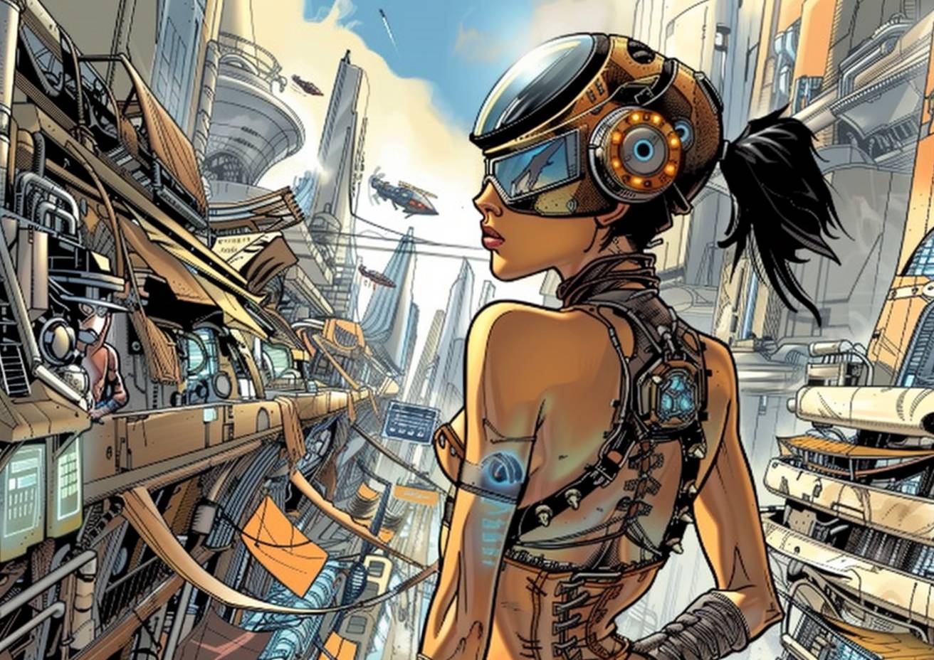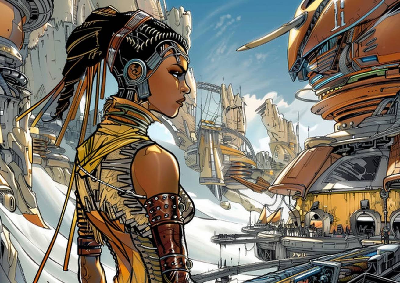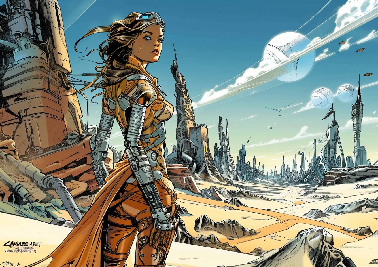 포스트 아포칼립스 미래에서 동물 가죽과 스터드 가죽을 입은 젊은 여성이 있습니다.