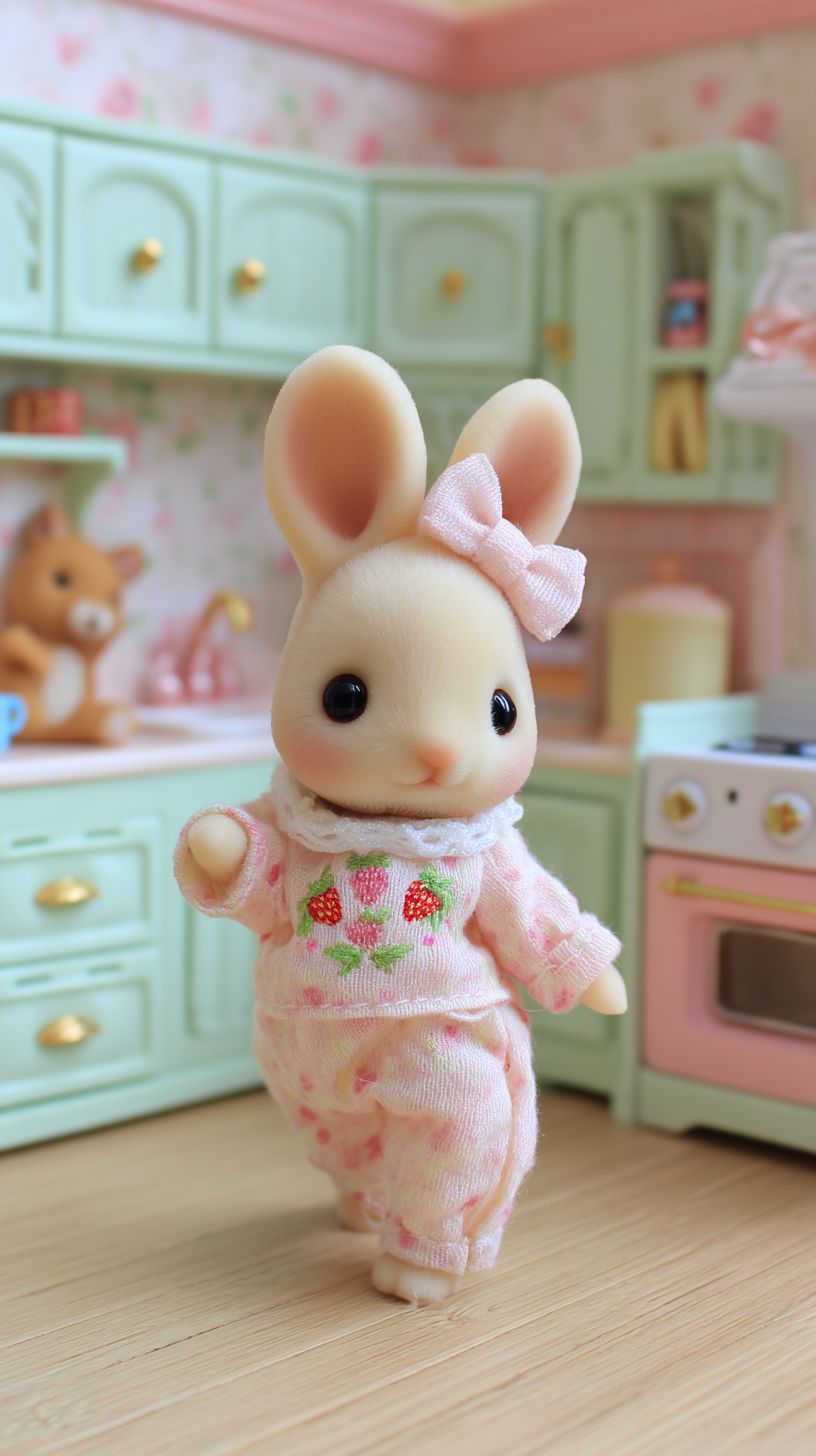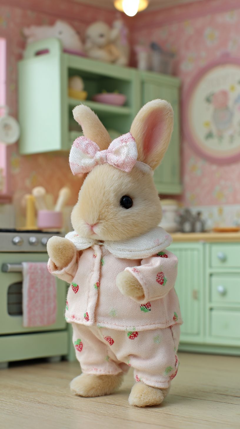 a cute very tiny baby beige rabbit wearing pink pajamas and a white collar with embroidered strawberries, a soft pastel-colored bow on its head, is staing in a cute kitchen setting. The rabbit stands on two legs like a human, as if dancing. in the background features light green cabinets, pink walls, and cozy accessories like plushies and wallpaper that reflect an adorable girl's aesthetic. real rabbit.Olympus OM-1 --ar 9:16 --s 50 --v 7.0 --raw
