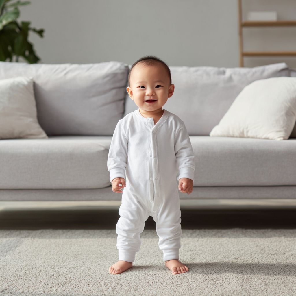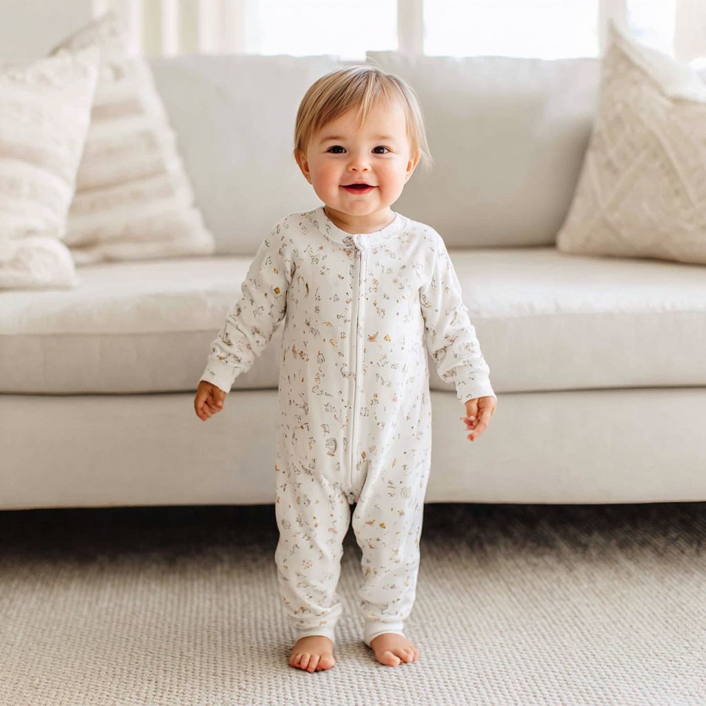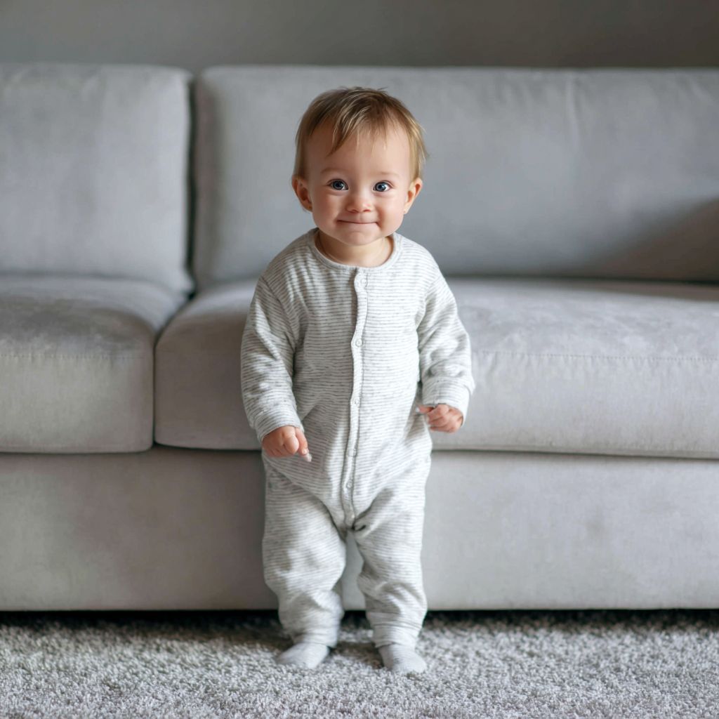 귀여운 아기 소녀가 파자마를 입고 소파 앞에 서 있습니다. 그녀는 흰색 면 잠옷을 입고 있으며, 손은 자연스럽게 옆으로 늘어져 있고, 미소를 짓고 있습니다. 전체 사진은 거실 배경에서 촬영되었으며, 연한 회색 카펫 바닥과 자연 채광이 부드러운 톤을 만들어냅니다. 사진은 소파 뒤에서 고해상도로 촬영되었습니다.