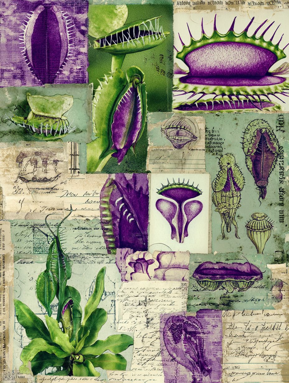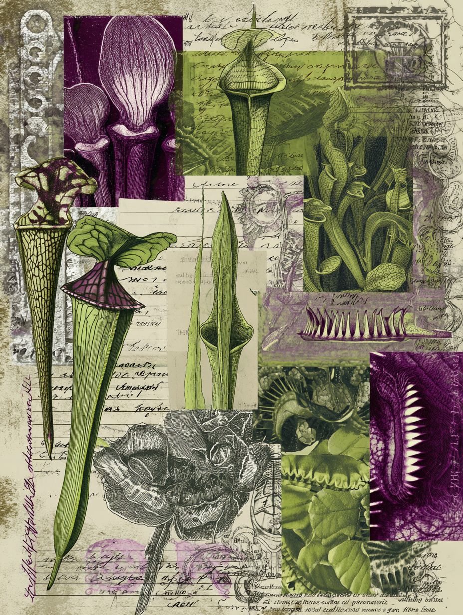 faux layered illustrated page of different carnivorous plant traps and teeth-like forms, collage layout, handwritten specimen labels, rich green and purple tones, botanical horror aesthetic, full printable page --ar 3:4 --raw --s 50
