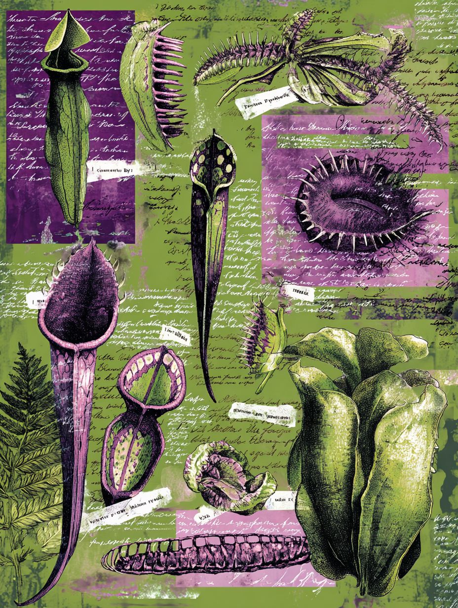 다양한 식충식물의 포획기와 이빨 형태를 보여주는 가짜 층 구조의 삽화 페이지, 콜라주 레이아웃, 손으로 쓴 표本 라벨, 풍부한 녹색 및 보라색 톤, 식물 공포 미학, 전체 인쇄 가능한 페이지.