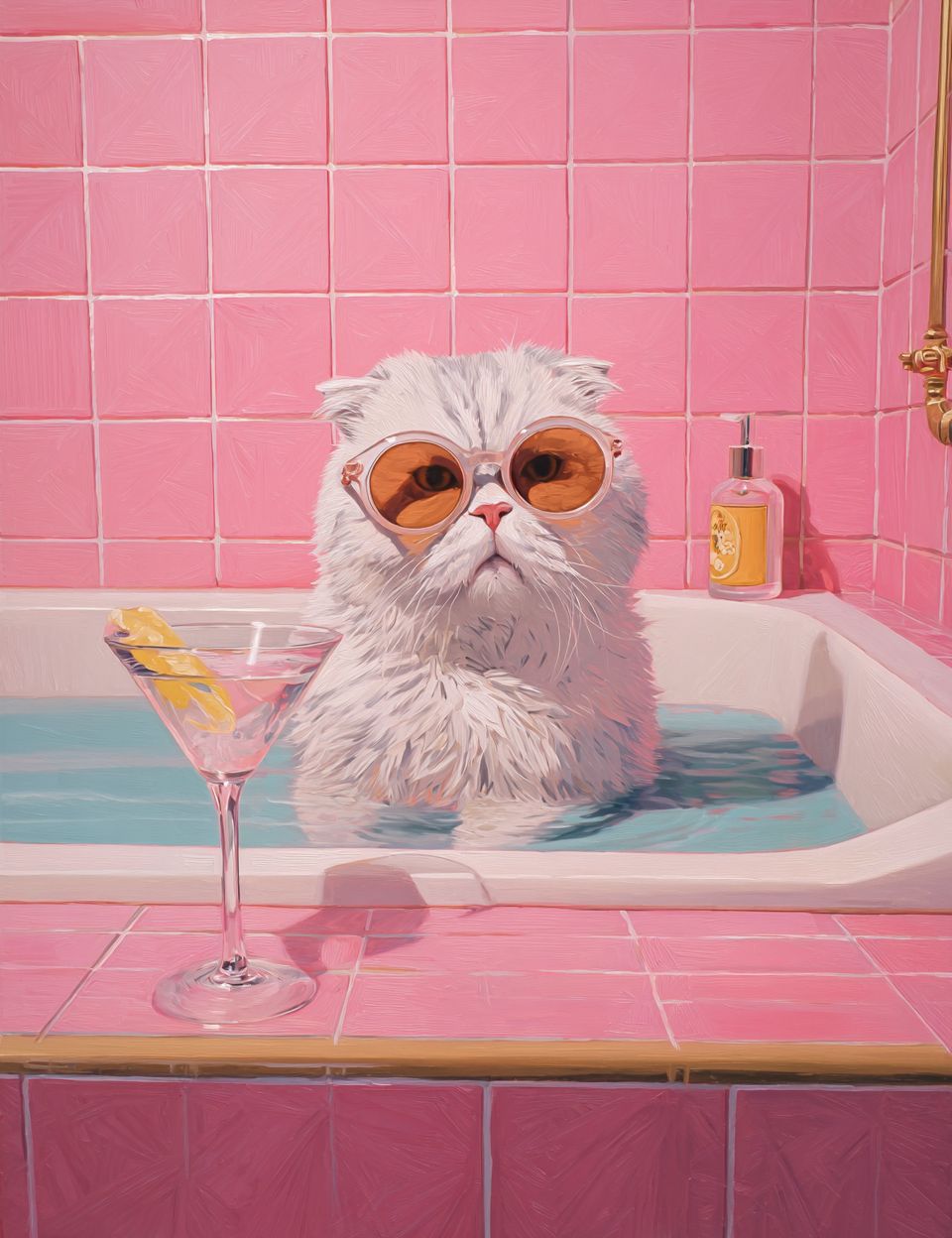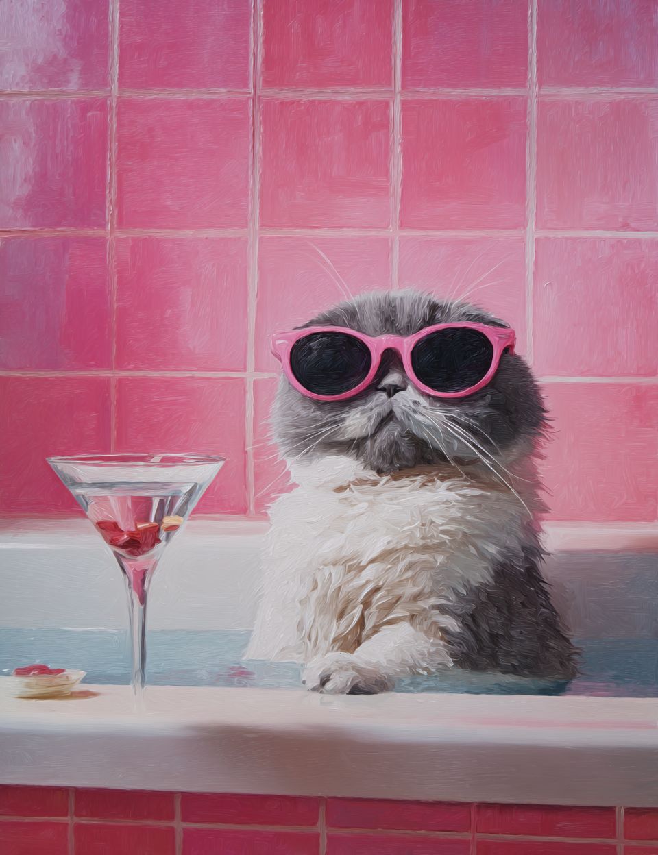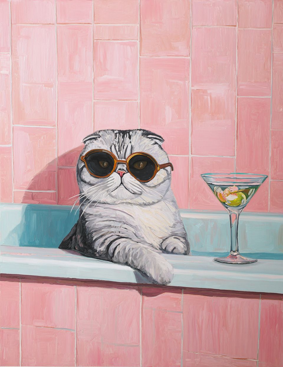 oil painting of an extremely cute scottish fold cat wearing sunglasses, sitting in the bathtub with a martini glass on the side. the bathroom is pink with tile wallpaper. in the style of a modern art portrait. --ar 99:128 --s 50 --raw