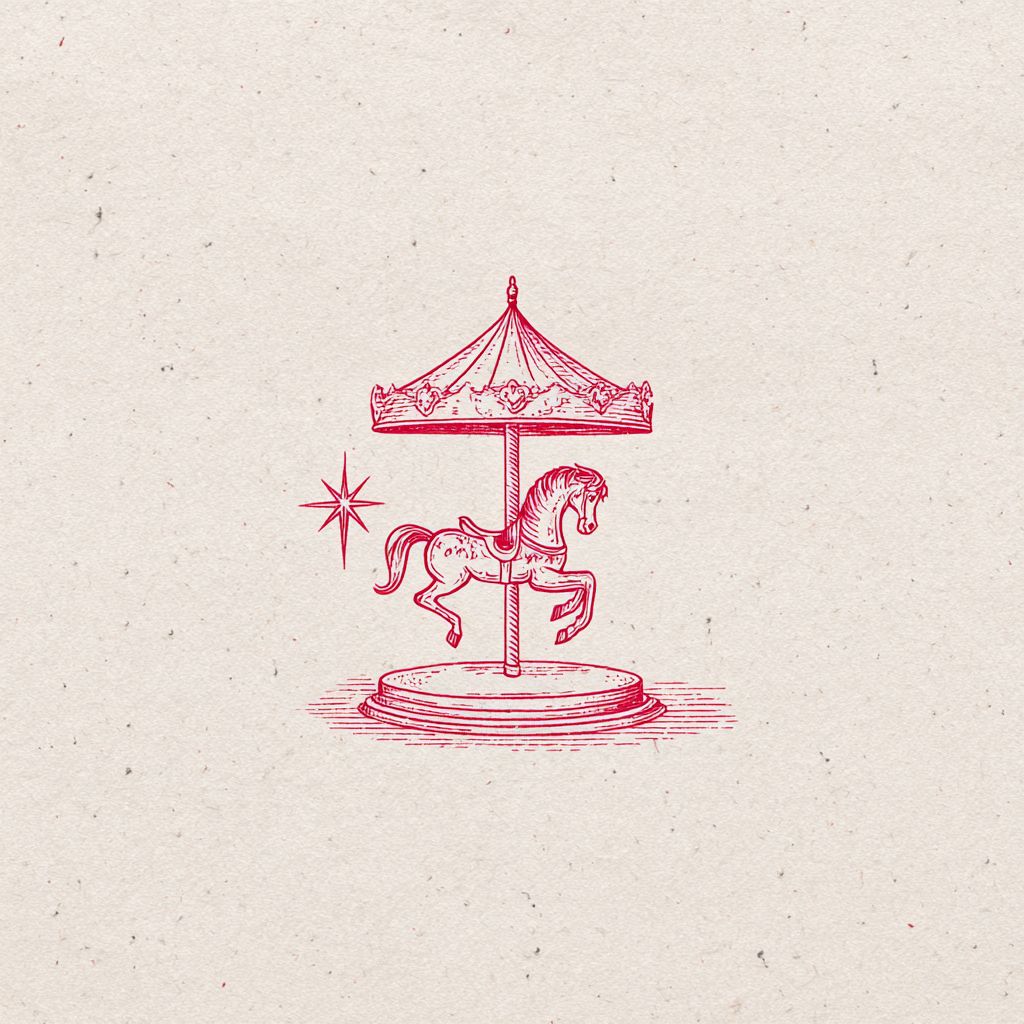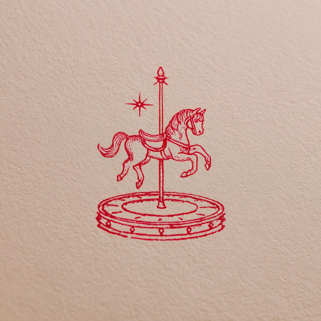 핑크색 종이에 섬세한 붉은 잉크 라인으로 묘사된 간단한 빈티지 말 회전목마 일러스트. 디자인은 미니멀하고 매력적이며, 말은 원형 플랫폼의 한쪽 끝에 중앙에 배치되어 있습니다. 왼쪽에 작은 별이 있어 장난스러운 느낌을 더합니다. 이 작품은 어린이거나 귀여운 일러스트를 좋아하는 사람들에게 적합하며, 생일 파티와 같은 회전목마가 있었던 어린 시절의 기억을 불러일으킬 수 있습니다.