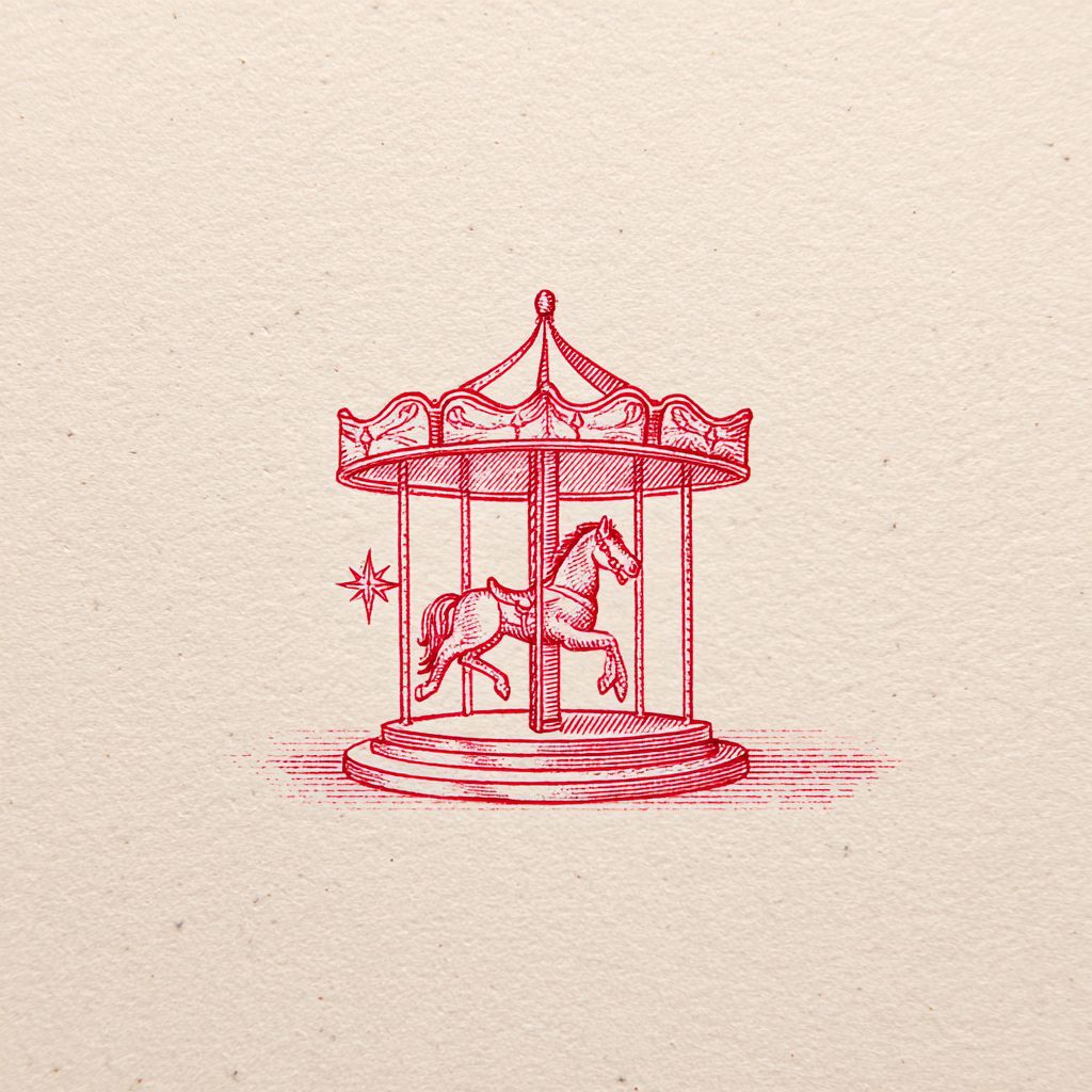a simple vintage illustration of a horse carousel, depicted in delicate red ink lines on pink paper. the design is minimalistic and charming, with the horse centered at one end of the circular platform. there's a small star to its left side, adding a touch of whimsy. this artwork would be suitable for children or those who like cute illustrations. it could also evoke memories from childhood events where carousels were found, such as birthday parties. --s 50 --v 7.0