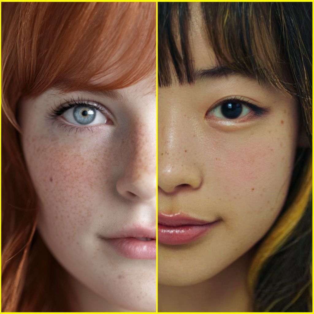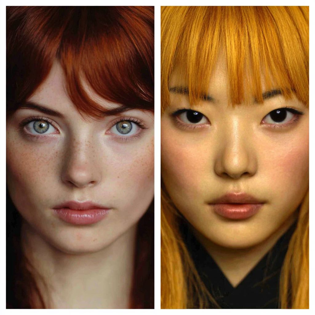 얼굴을 두 부분으로 나눕니다. 왼쪽은 파란 눈과 빨간 머리를 가진 백인 여성이고, 오른쪽은 검은 눈과 금발 머리를 가진 일본 여성입니다. 얼굴은 3:4 비율로 균일해야 합니다.