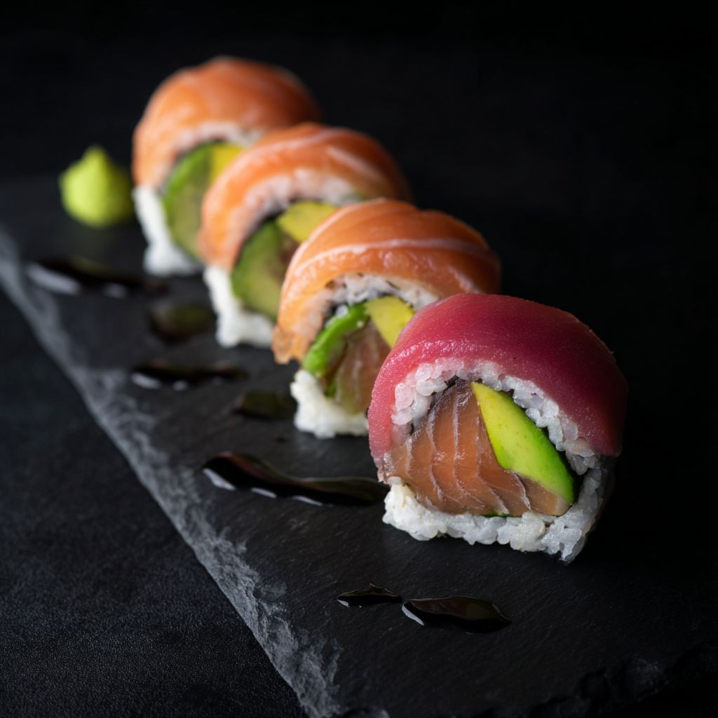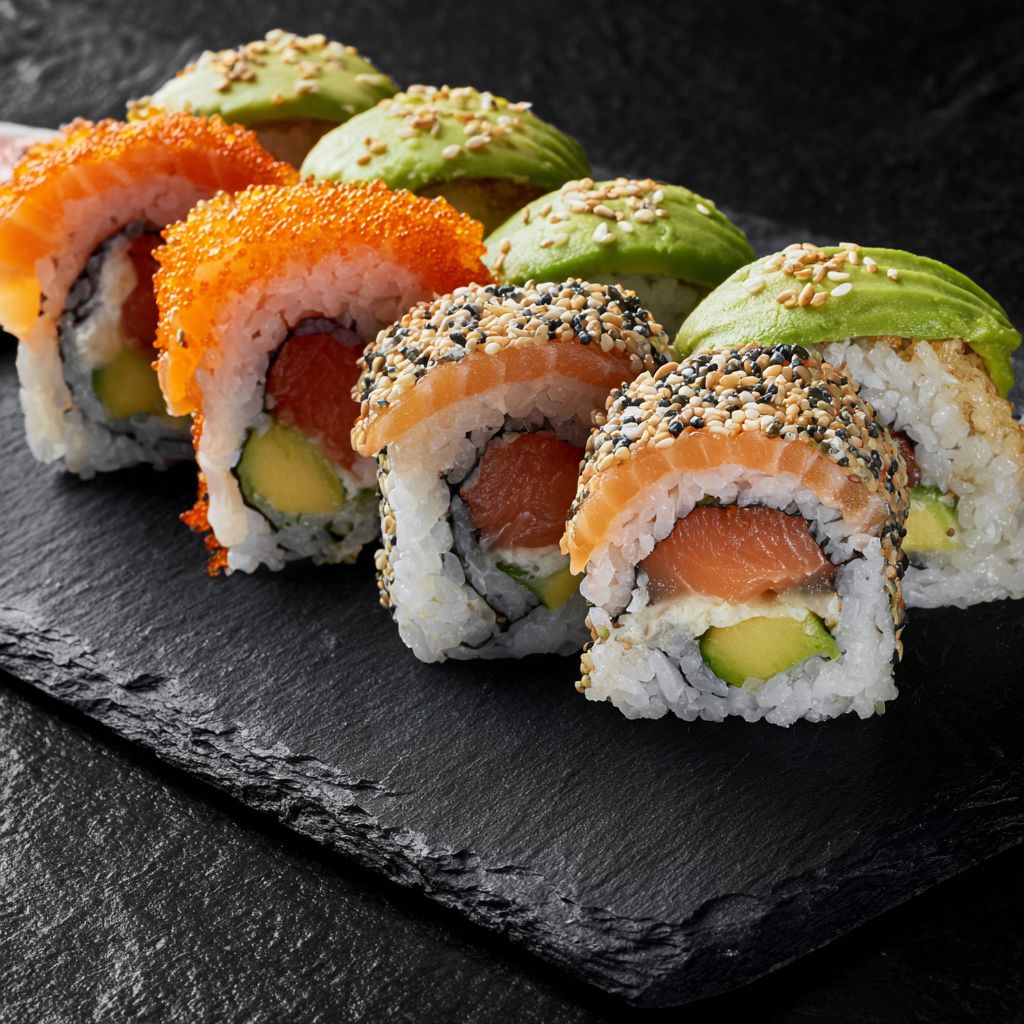 food photography, close-up sushi rolls on a black slate plate, philadelphia, salmon, orange-pink, avocado, minimalistic --s 50 --v 7.0