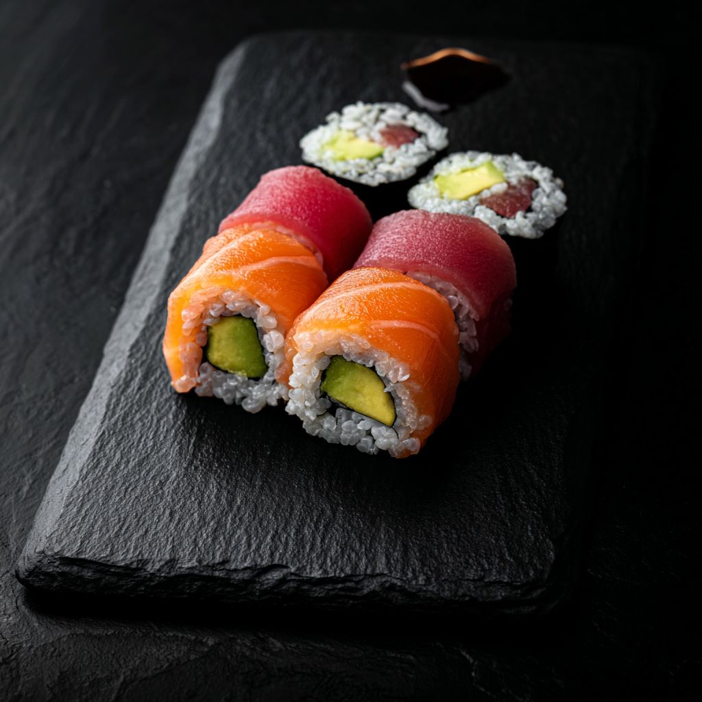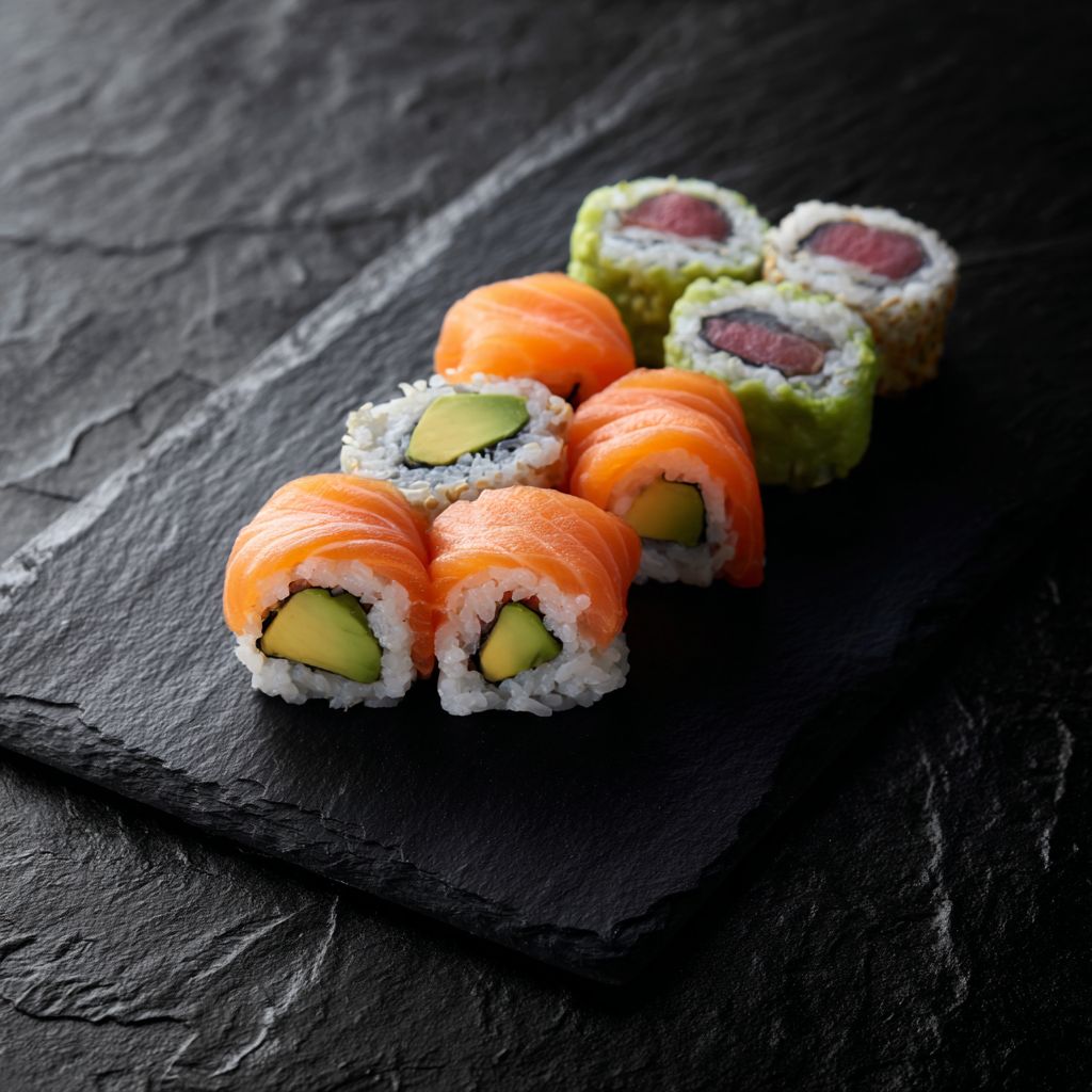 food photography, close-up sushi rolls on a black slate plate, philadelphia, salmon, orange-pink, avocado, minimalistic --s 50 --v 7.0