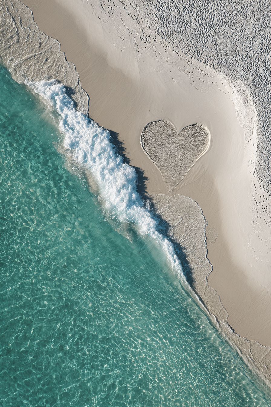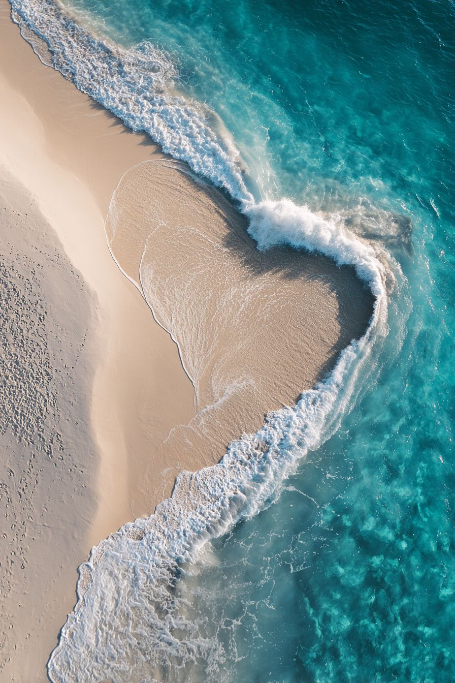 Top-down aerial view of a pristine white sand beach, crystal-clear turquoise waves forming a perfect heart shape as they meet the shore, elegant and minimal composition, soft natural sunlight, dreamy coastal aesthetic, refined luxury mood, high contrast between sand and water, smooth textures, cinematic realism, drone photography style, ultra-detailed, serene, romantic, fine art photography --ar 2:3
