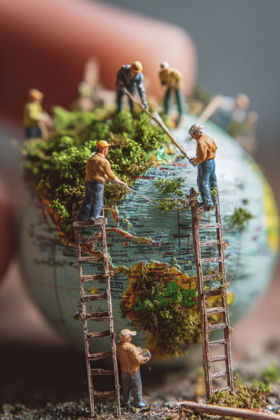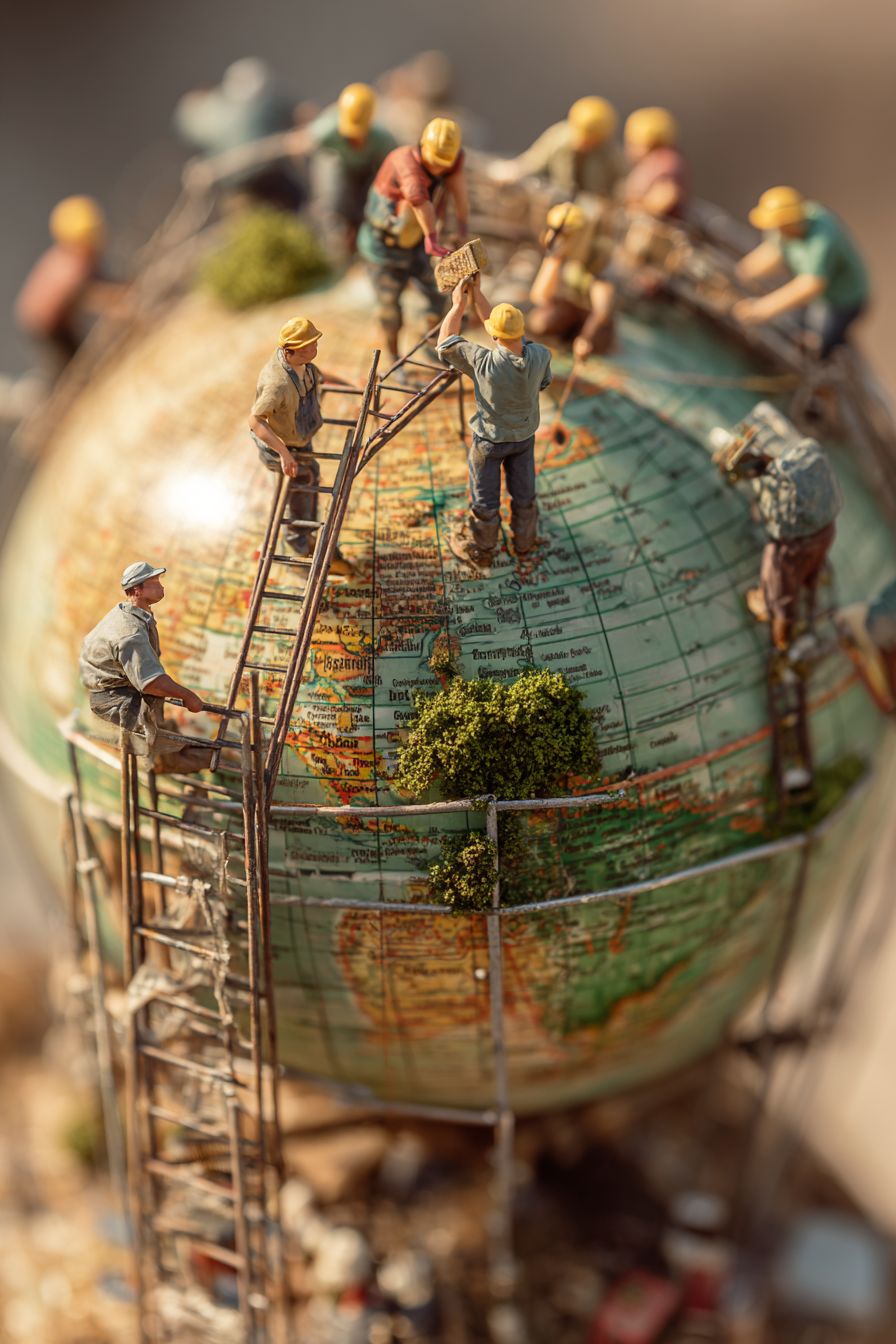 miniature people carefully restoring a globe, tiny builders and restorers repairing the world with ladders, scaffolding, brushes and tools, cracks being mended, greenery growing back, collaboration and care, hopeful atmosphere, warm soft light, macro photography, tilt-shift effect, ultra detailed, cinematic, inspirational, we see the whole image, enough space is provided around the globe --ar 2:3 --raw