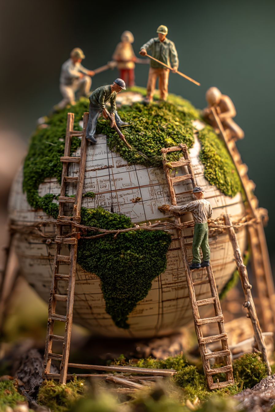 미니어쳐 사람들이 지구본을 조심스럽게 복원하고 있습니다. 미세한 건축가와 복원자들이 사다리, 비계, 브러시 및 도구를 사용해 세상을 수리하며, 균열이 보수되고, 녹지가 다시 자라나고, 협력과 배려가 이루어지고 있습니다. 희망적인 분위기, 따뜻하고 부드러운 빛, 매크로 사진, 틸트-쉬프트 효과, 초정밀, 영화 같은, 영감을 주는, 우리는 전체 이미지를 보고 있으며, 지구본 주변에 충분한 공간이 제공되고 있습니다.