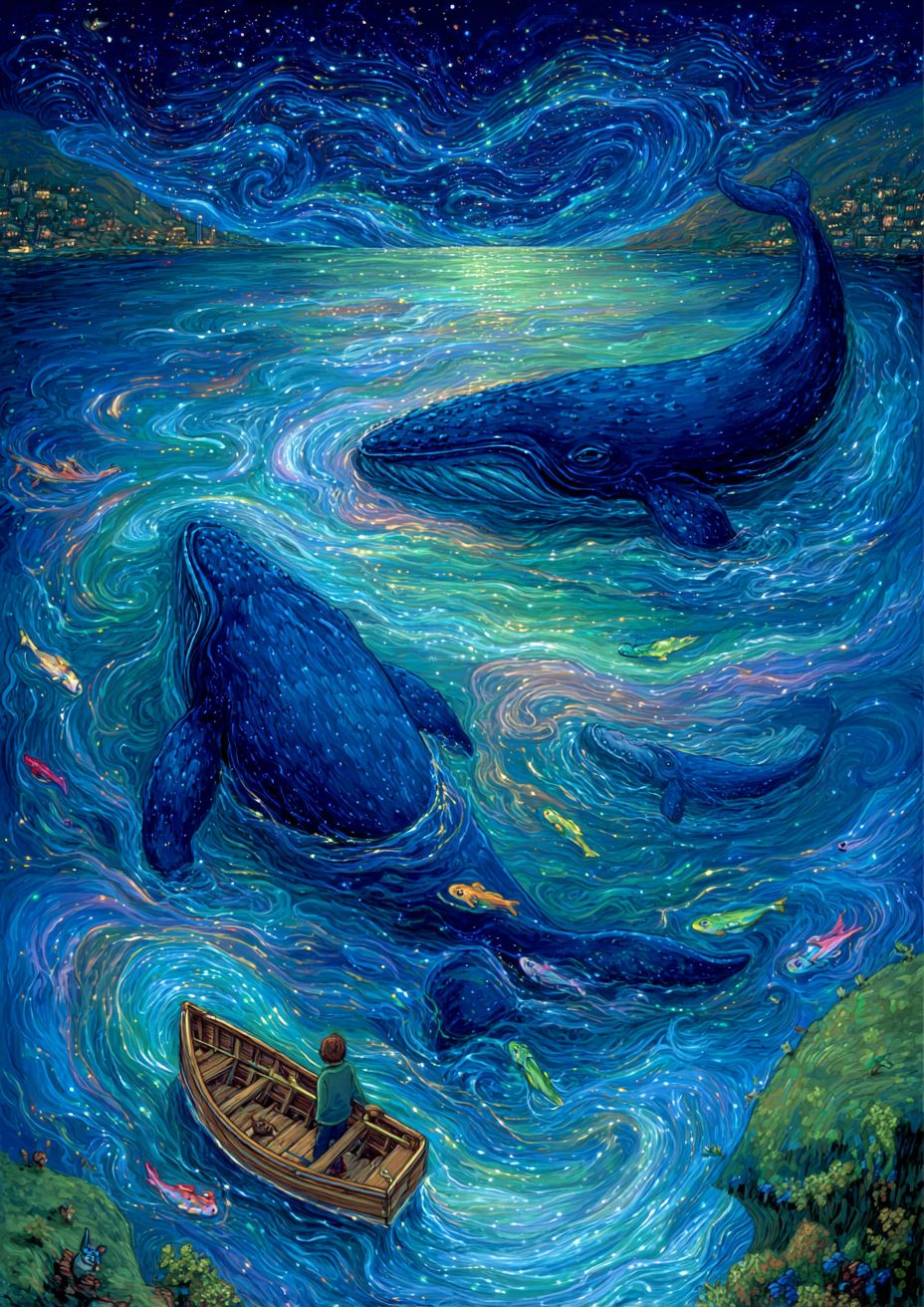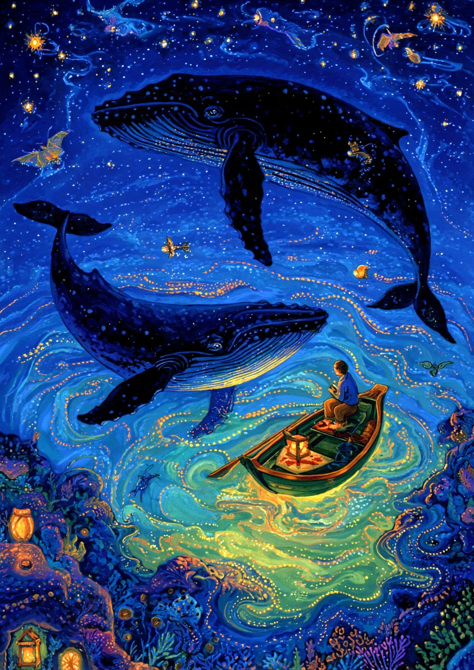 파란 바다 위에 금빛 반짝임이 있으며, 그 표면에는 각각 반대 방향으로 헤엄치는 두 마리의 혹등고래 윤곽이 있습니다. 작은 노젖는 그들 근처에 떠 있으며, 그 안에는 여성이 앉아 그들의 실루엣을 올려다보고 있습니다. 그 위에는 별이 빛나는 밤하늘이 있습니다. 이것은 단순한 아크릴 그림입니다.