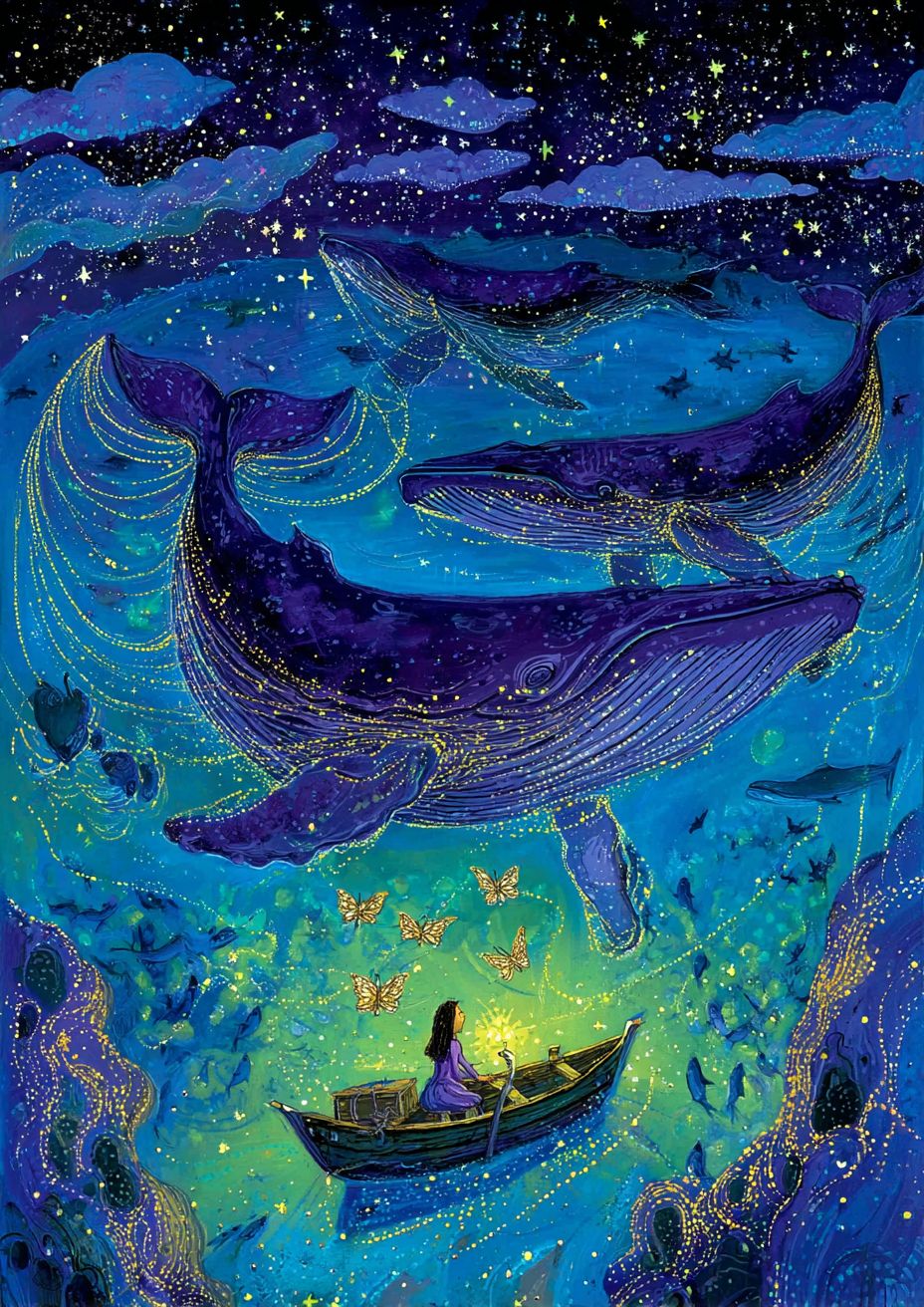 a blue sea with golden glitter, on the surface of which there is an outline of two humpback whales swimming in opposite directions. a small rowboat floats near them, and a woman sits inside, looking up at their silhouettes. above is a night sky with stars. this is a simple acrylic painting. --ar 5:7 --profile jmlwfdb
