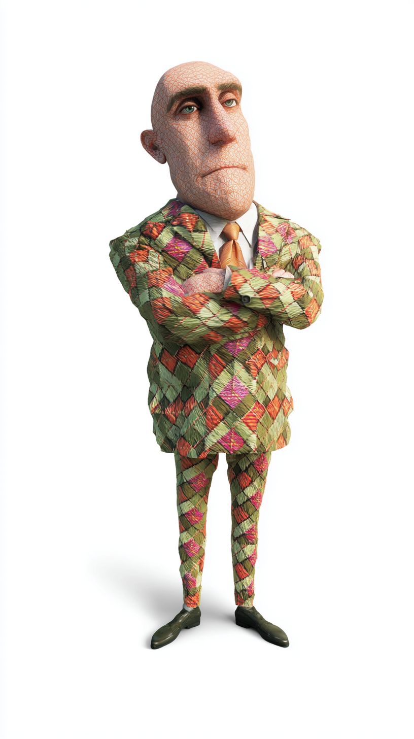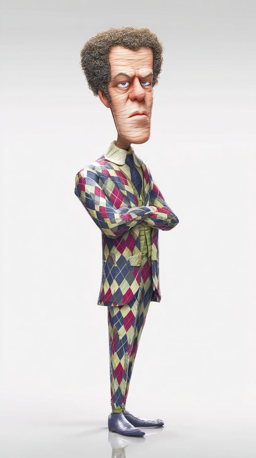 전체 신체 3D 캐리커쳐 캐릭터, 크럼플 페이퍼 질감에 보이는 표면 주름, 과도하게 큰 머리와 작은 몸, 40대의 허세 많은 영국 변호사, 지나치게 진지한 표정, 과장된 영국 아가일 다이아몬드 체크 수트 착용, 고전 귀족 트위드 패턴에 다채로운 다이아몬드 모양, 다소 시끄럽고 구식의 정장 패션, 45도 각도로 서 있음, 스튜디오 조명, 평면 화이트 배경, 높은 디테일, 8K