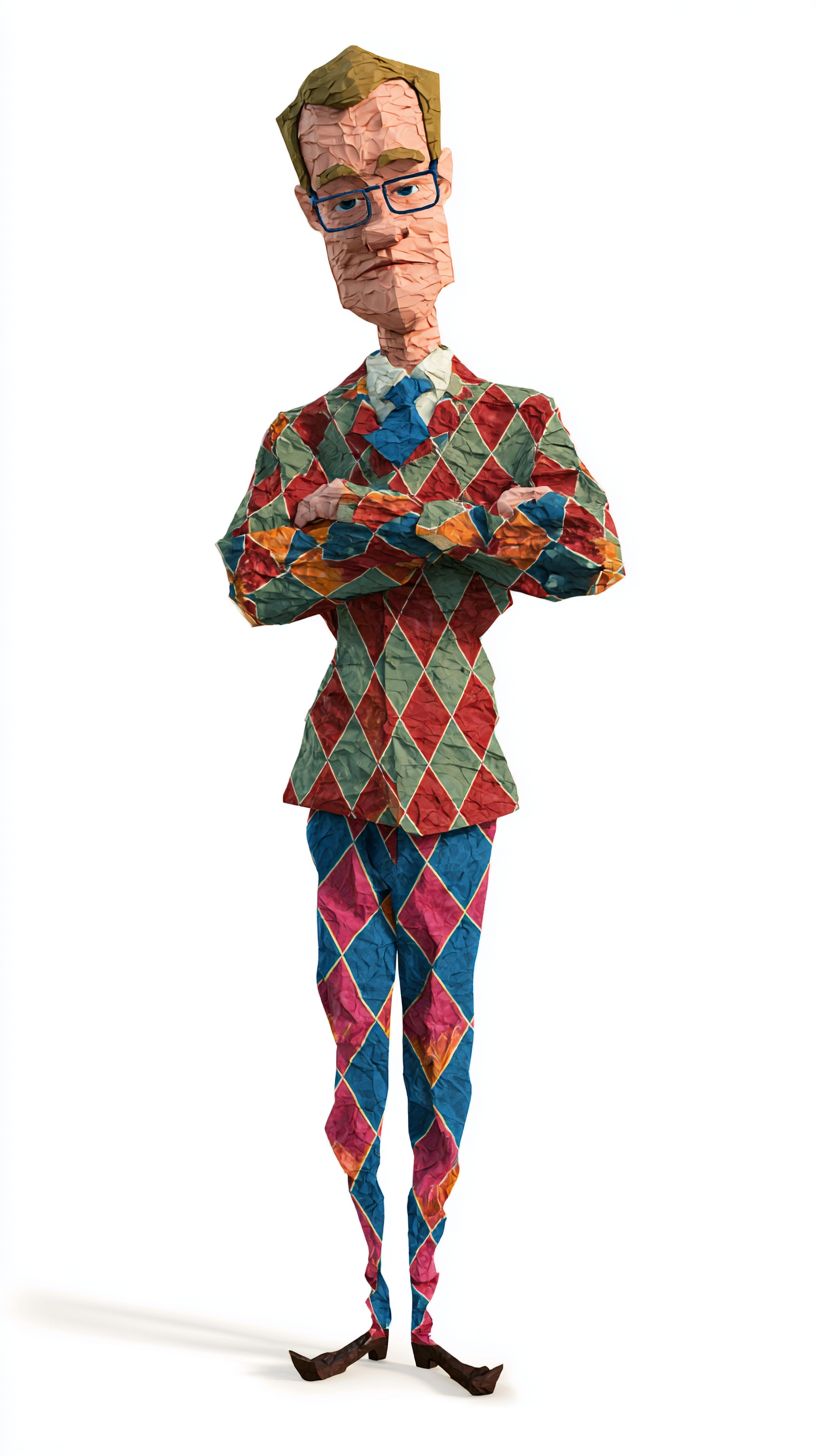 a full-body 3D caricature character, crumpled paper texture with visible surface folds, oversized head and tiny body, a pretentious British lawyer in his 40s, overly serious expression, wearing an exaggerated British argyle diamond check suit, classic aristocratic tweed pattern with colorful diamond shapes, slightly loud and outdated formal fashion, standing at a 45-degree angle, studio lighting, flat white background, high detail, 8k --ar 9:16 --profile wiag2c5 --stylize 0