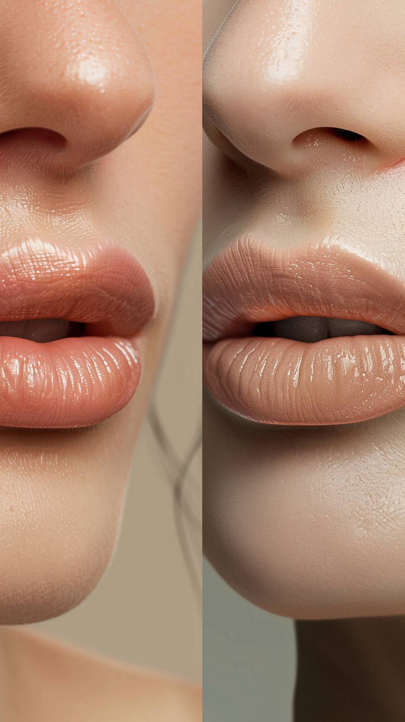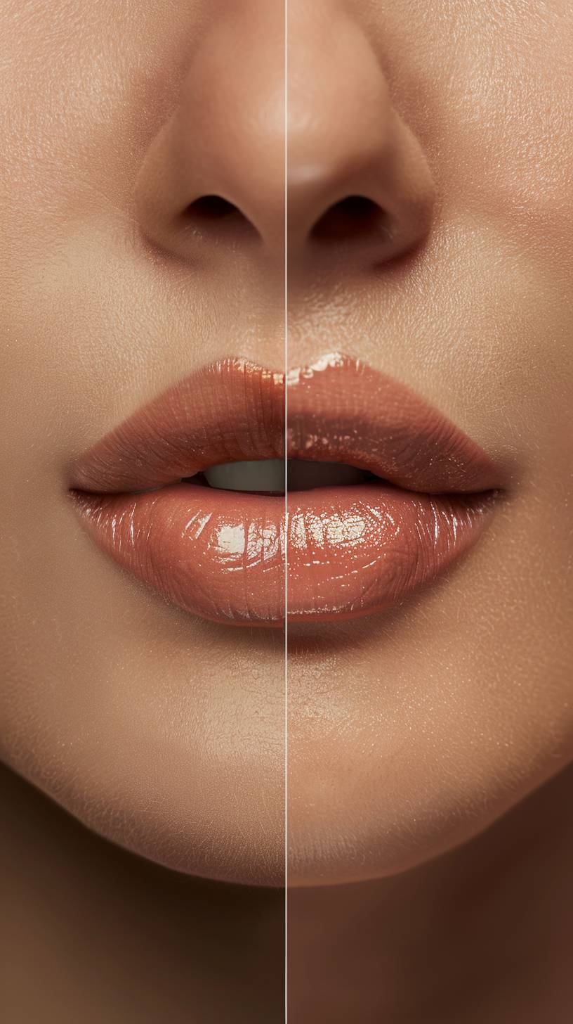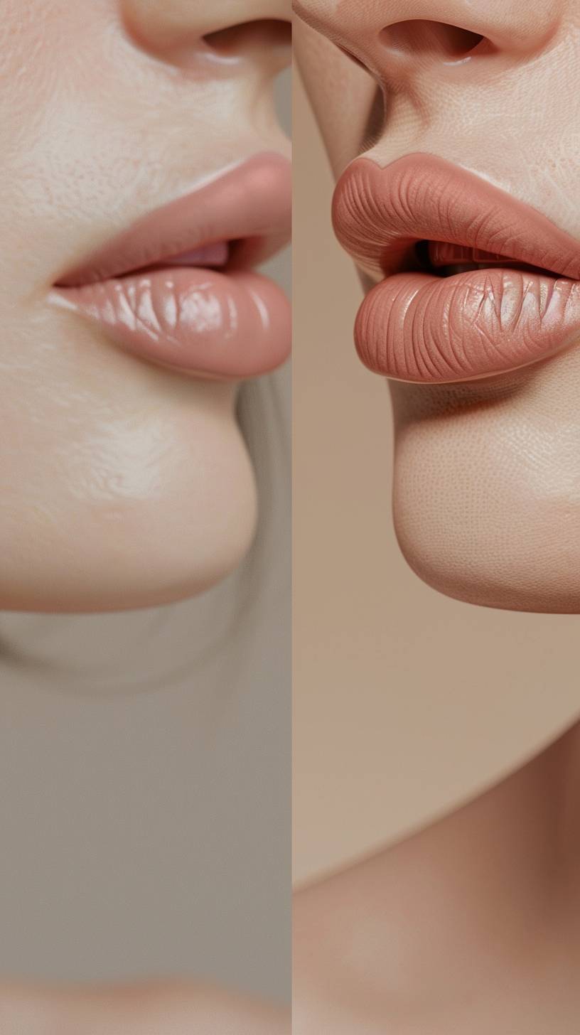 A side-by-side comparison image showing the before and after effects of lip filler treatment. On the left, the 'before' image shows natural, thinner lips. On the right, the 'after' image shows fuller, plumper lips with a smooth and enhanced appearance. The background is a clean, professional medical office setting, highlighting the aesthetic improvement from the treatment. Photo realistic, hi definition --ar 9:16 --v 6.0