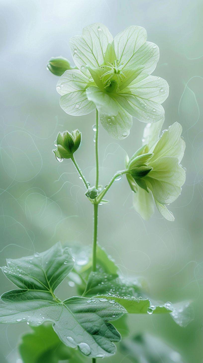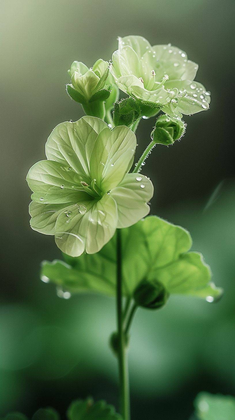 엷은 녹색 제라늄, 가지에 두 개의 꽃봉오리, 세 개의 부드러운 녹색 잎, 수정처럼 맑은 이슬 방울, 초고화질 비주얼, 사실감, 배경 흐림.