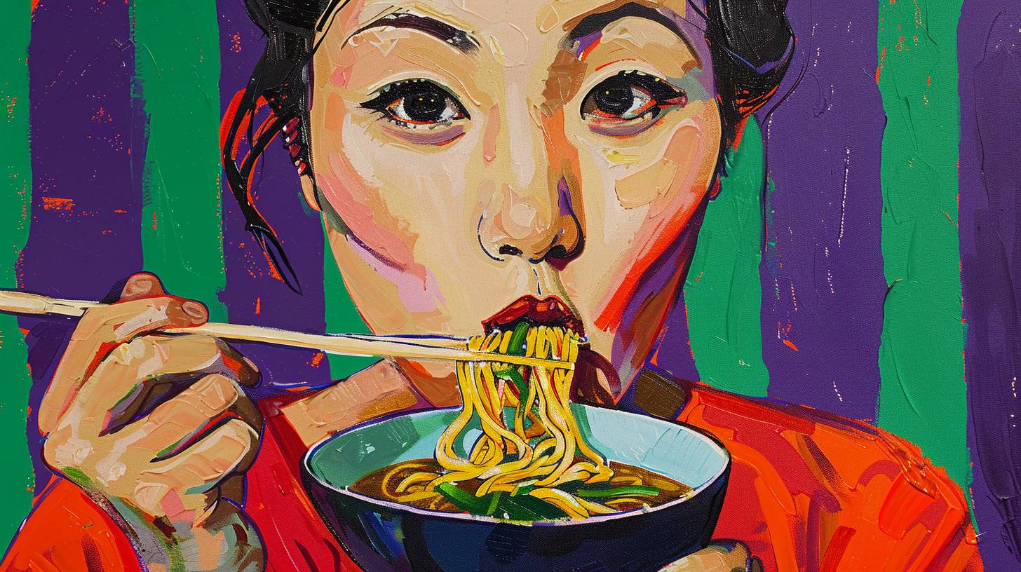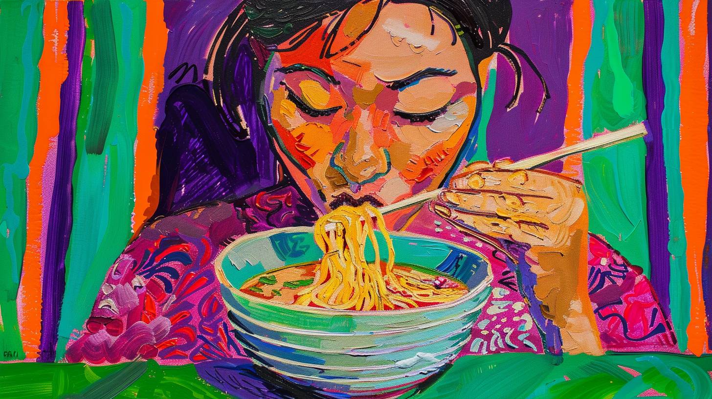 Woman eating a bowl of ramen, with Chinese chopsticks, noodles in her mouth, green and purple striped tablecloth, Henri Matisse style, bright colors, gouache technique, textured gouache --ar 16:9 --style raw --v 6.0