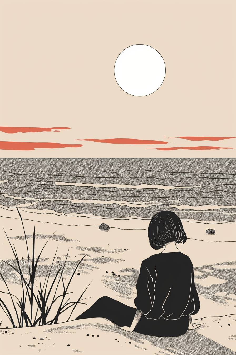 1970년대 짧은 머리의 소녀가 해변에서 매우 외롭게 느끼는 선형 일러스트, 미니멀 아트 스타일.